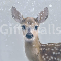 Decorative mural featuring a winter fawn amidst snow and subtle forest details.