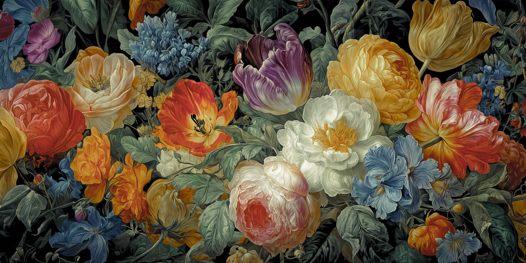 Adorn your walls with the Radiant Blooms Harmony Wall Mural, a captivating and opulent tribute to the lush beauty of a flourishing garden. This exquisite mural wallpaper features a rich and detailed depiction of various radiant blossoms, including tulips, peonies, and other vibrant flowers, nestled amongst deep green foliage against a dark, dramatic background. Rendered with an artistic aesthetic that evokes the grandeur of classical floral paintings, it creates a luxurious and immersive visual statement. Designed to bring a touch of sophisticated charm and natural splendor, this wallpaper for walls is ideal for living rooms, dining areas, or any space desiring a bold artistic statement and a touch of unique flair. Its intricate details and harmonious, rich color palette will beautifully elevate your interior, offering a continuous flourish of captivating design. Easy to hang and durable, it's a simple way to introduce sophisticated appeal into your home.