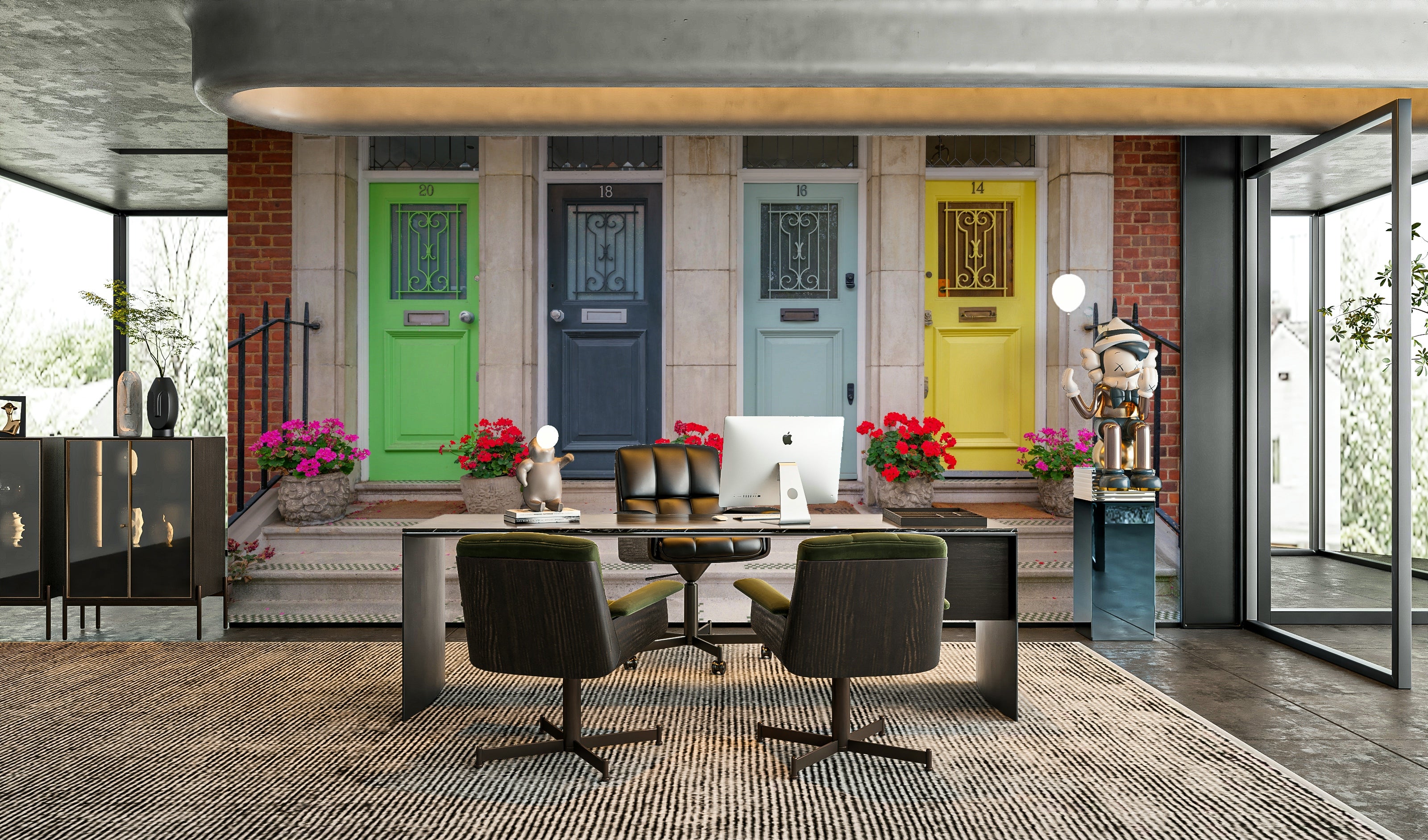 Bring cheerful charm to your space with the Radiant Doorscape Wall Mural. This vibrant scene features a row of colorful front doors in shades of green, blue, and yellow, framed by lush flower-filled planters. The mural exudes a sense of welcoming warmth and lively energy, making it ideal for entryways, living rooms, or any area in need of an upbeat touch. The playful color palette and attention to detail will inspire joy and create a sense of homely comfort. It’s perfect for those who love bright colors, unique design, and the spirit of community.
