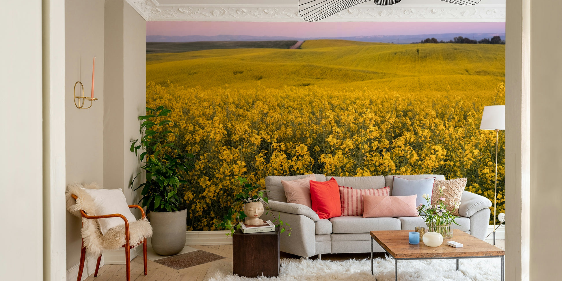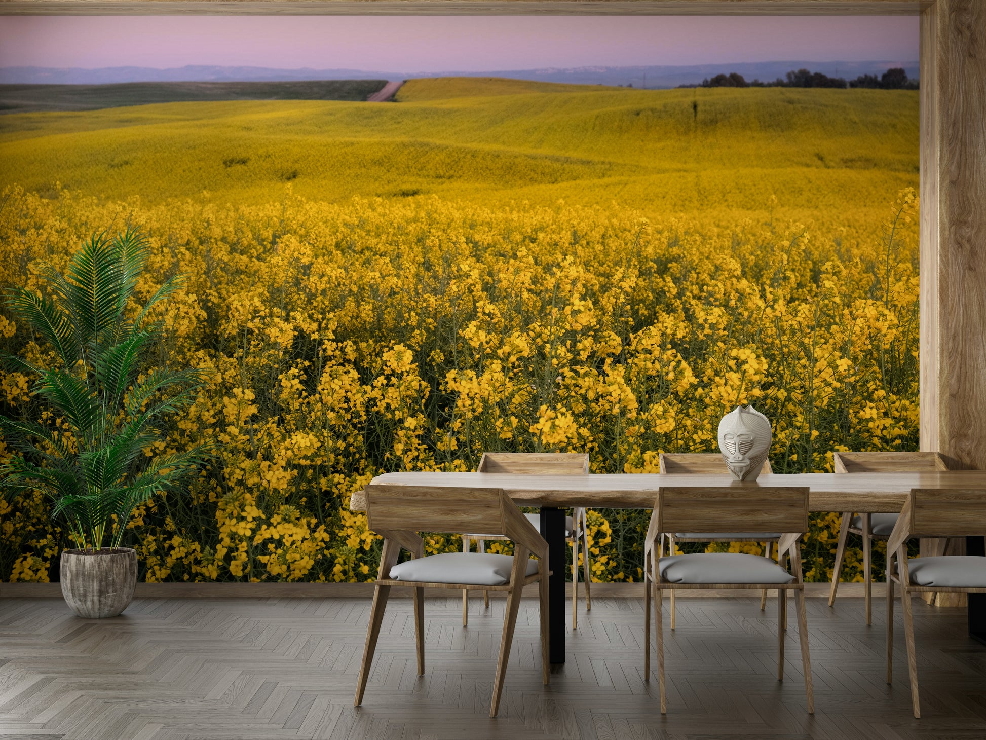 Breathe life into your interiors with this stunning vista of flowering fields. The design bursts with bright yellows, bringing a sunny and energizing vibe to any room. Install this wallpaper for walls in your living room, dining room, or bedroom to create a vibrant focal point. The rolling landscape introduces depth and charm, while the yellow hues complement both neutral and colorful furnishings. Let this joyful image transform your space with its scenic allure.