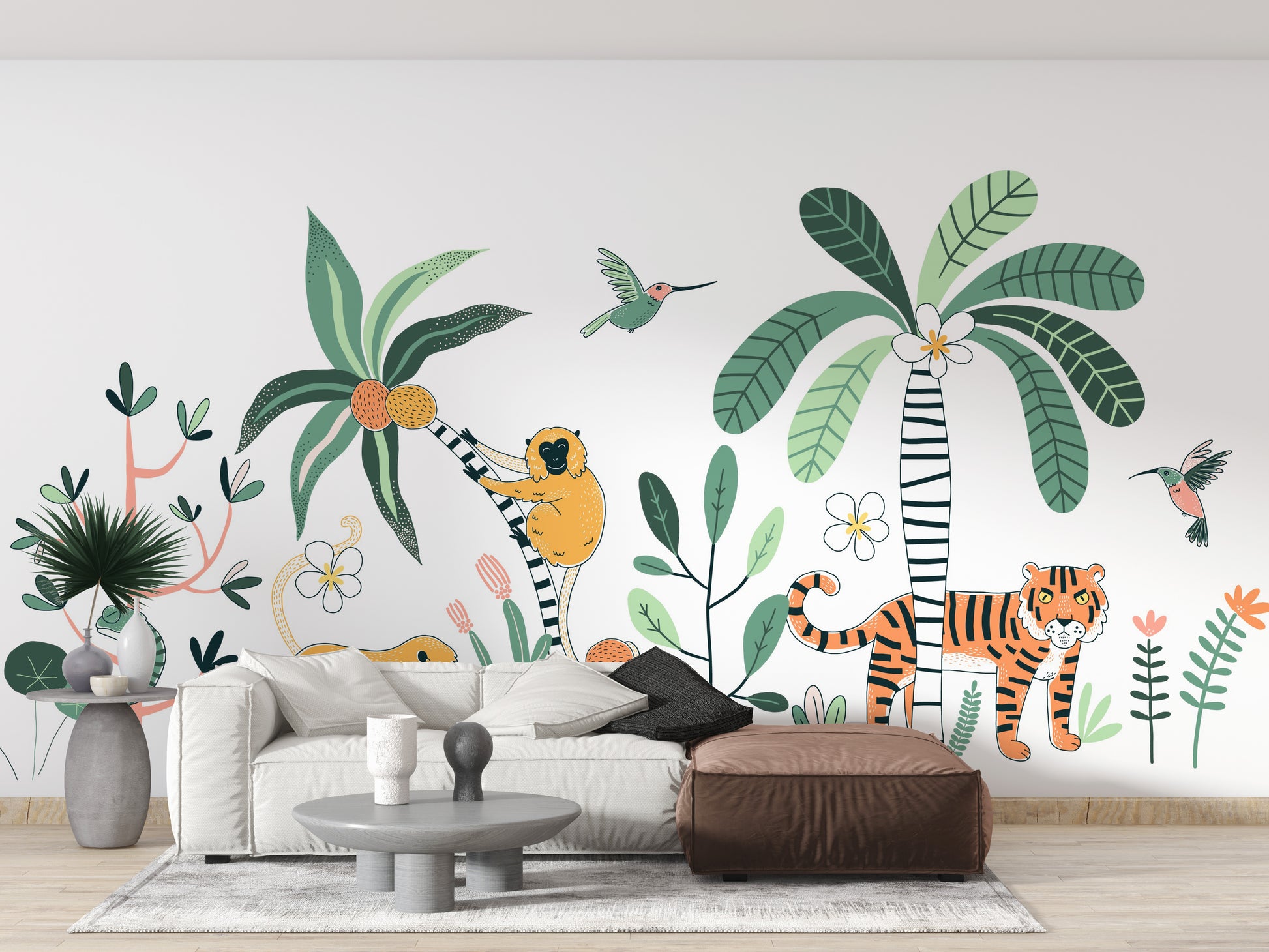 Wildlife mural wallpaper with tiger and palm trees.