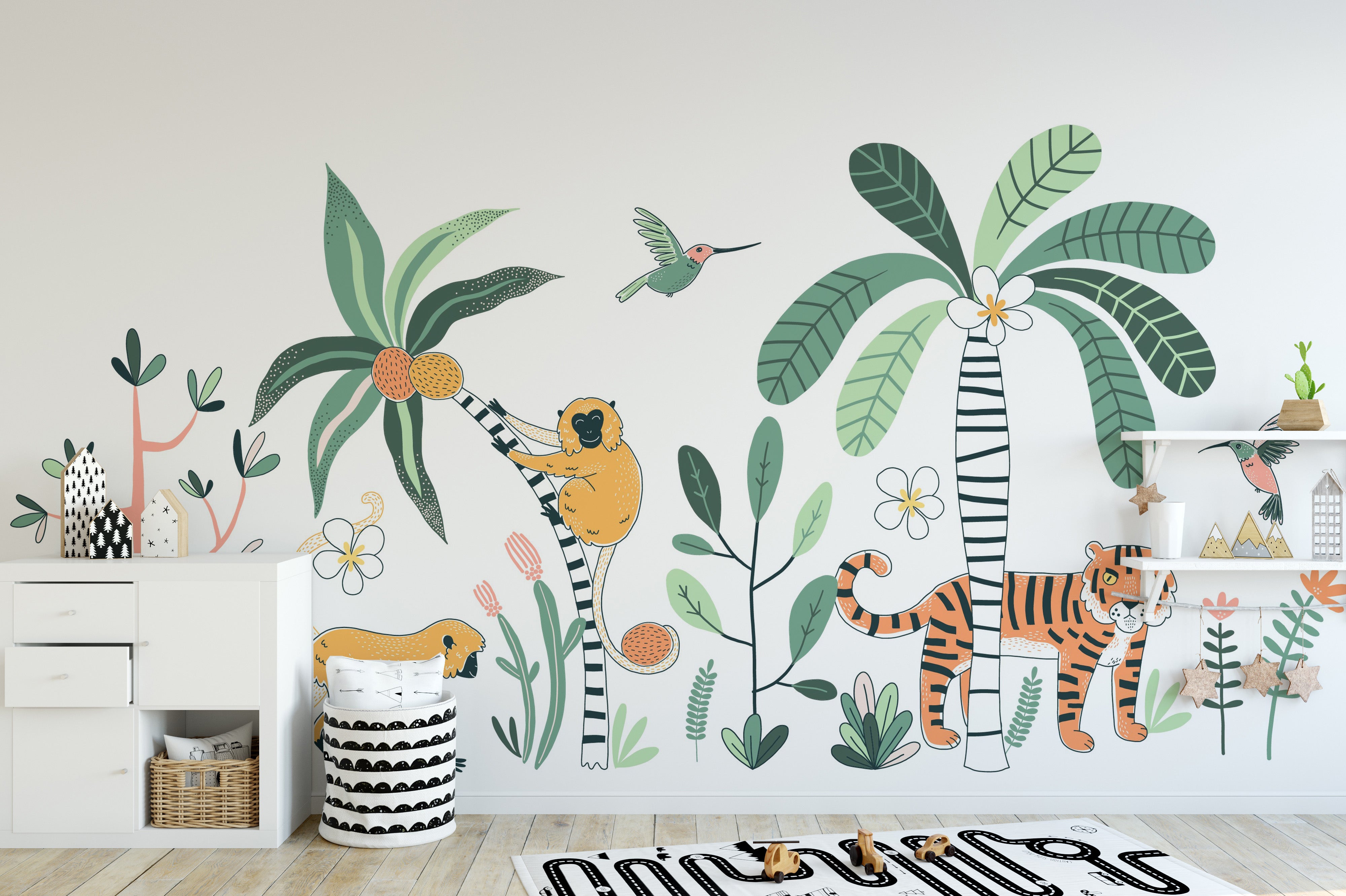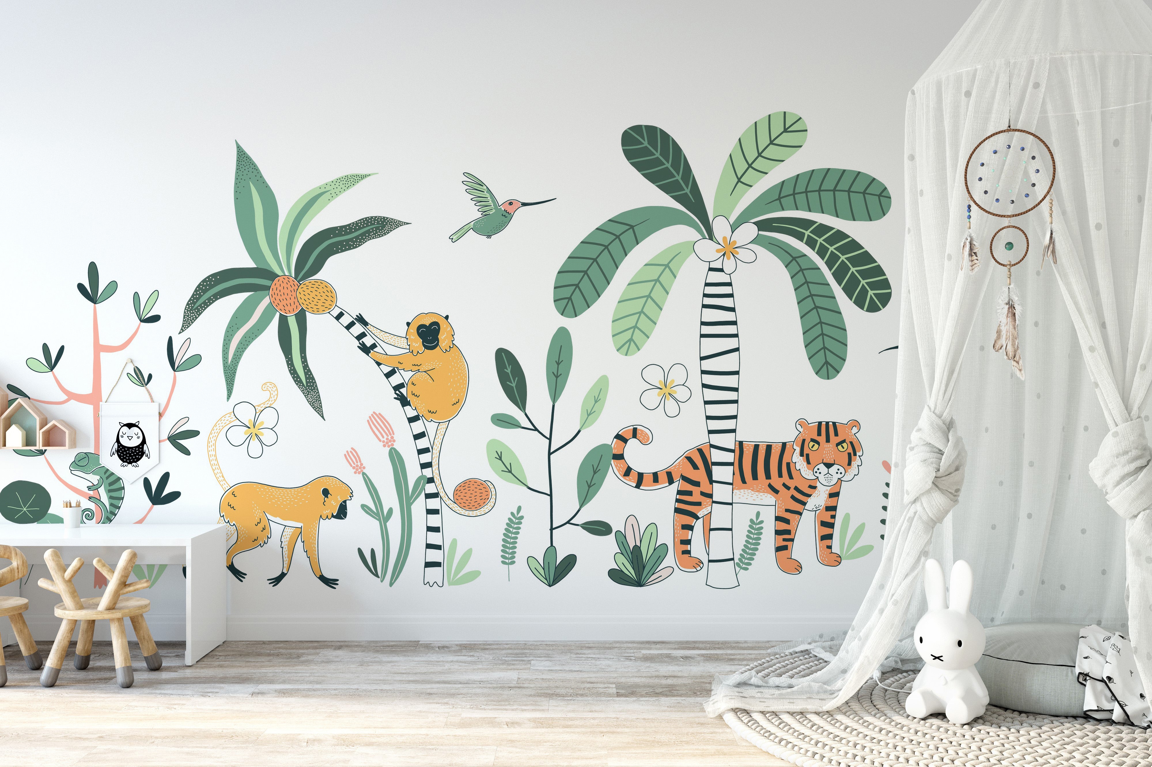 Vibrant and lively, this hand-drawn mural wallpaper features a captivating rainforest scene, perfect for enhancing a child's room. The design showcases a rich array of rainforest fauna, bringing an adventurous spirit to any kids space. The vivid colours and detailed illustrations of animals and foliage create an engaging and educational backdrop. This wallpaper is ideal for creating an inviting and dynamic environment in a kids room, stimulating imagination and curiosity about the natural world. Suitable for play areas and bedrooms, it adds a touch of nature's beauty and diversity, making it a unique and enriching addition to a young one's living space.