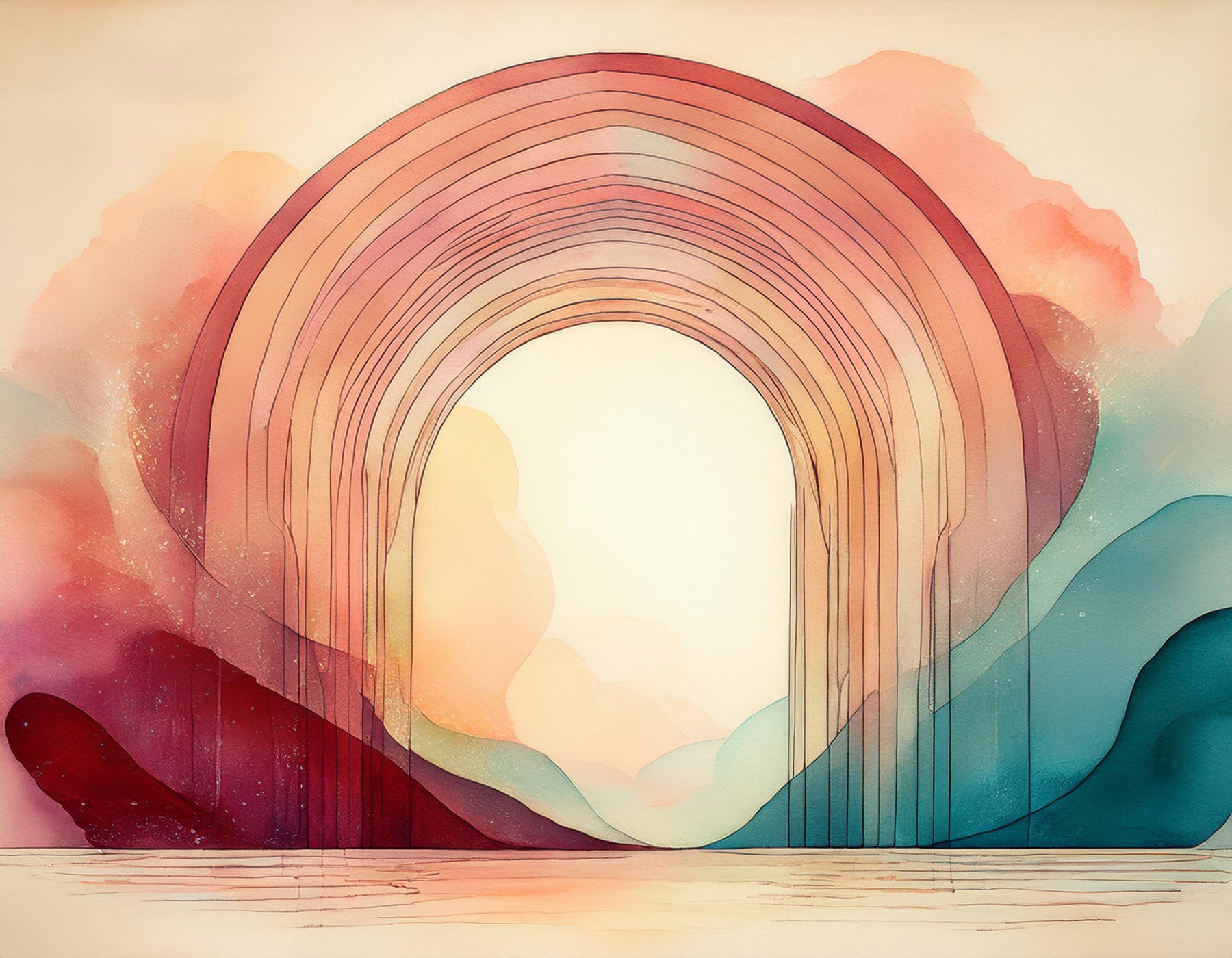 This breathtaking wallpaper features a captivating watercolor landscape dominated by a large, arched structure composed of layered, pastel-toned stripes. These stripes evoke the feeling of a rainbow cascading downward, creating a sense of movement and tranquility. The archway frames a serene, light-filled space, contrasting beautifully with the rich, earthy hues of the surrounding hills and water. The blend of soft colors—peach, teal, and burgundy—with the delicate linework produces a calming and dreamy atmosphere, perfect for creating a peaceful and meditative ambiance in any room. The overall effect is one of ethereal beauty and gentle serenity.