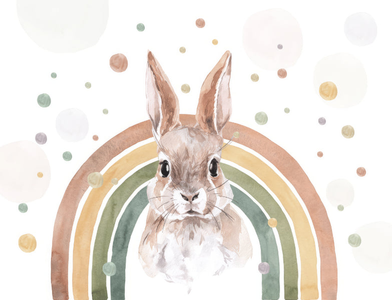 Watercolor rabbit mural with soft rainbows