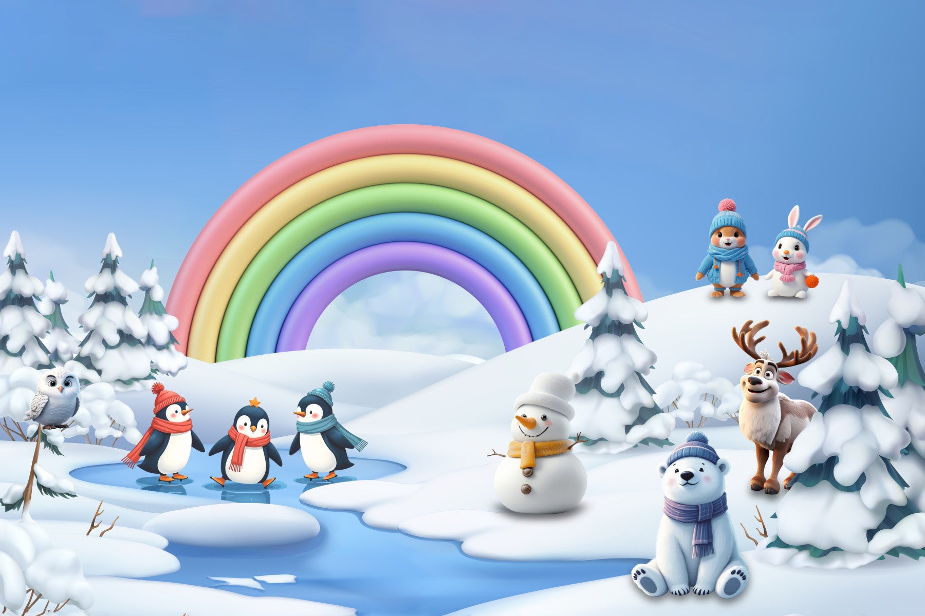 Bring a smile to any room with this vibrant wallpaper for walls. The charming design features adorable cartoon animals enjoying a snowy landscape beneath a pastel rainbow. Soft blues, pinks, and whites create a cheerful ambiance. Ideal for nurseries, kids' rooms, or playrooms, this wallpaper design complements interiors with its playful and imaginative scene, creating a cozy and inviting space. Let this delightful design transform your child’s room into a magical winter escape.