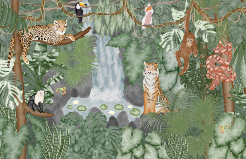Delight young explorers with the Rainforest Paradise Wall Mural, where every inch is an adventure for inquisitive minds. This kids room wallpaper is a rich tapestry of jungle life, bustling with playful monkeys, a secretive jaguar, and a proud tiger amongst lush greenery and a cascading waterfall. Crafted to spark imaginations, it's a perfect backdrop for bedtime stories and playtime adventures, where children can dream of exploring wild forests and making friends with exotic animals. Watch their eyes light up with wonder as they discover new creatures and stories within the foliage, making their room a personal jungle to roam and rule. This mural brings nature's vibrant theater to life, ensuring a magical journey awaits every day.