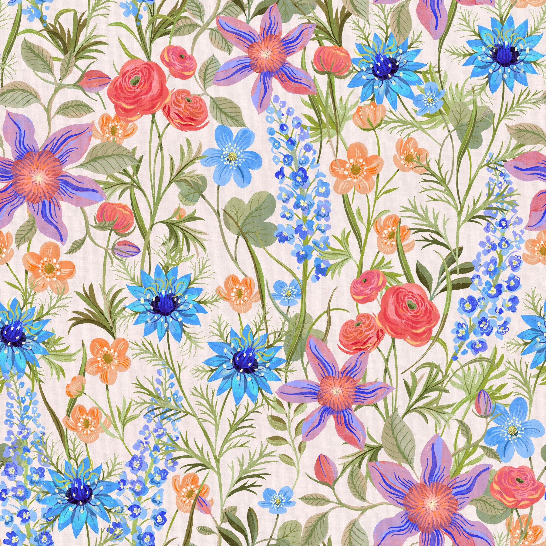 Embrace a vintage floral fantasy with this "Ranunculaceae Retro Strong Offwhite" wallpaper. Vibrant, stylized Ranunculaceae blooms in bold blues and coral pinks dance across a soft off-white backdrop. The retro aesthetic is achieved through a painterly style and a rich, saturated color palette. This strong and sophisticated design features a seamless repeat pattern, perfect for adding a touch of botanical elegance to any digital device. The delicate yet striking flowers create a captivating scene, blending modern design sensibilities with classic floral charm for a truly unique and unforgettable wallpaper experience.