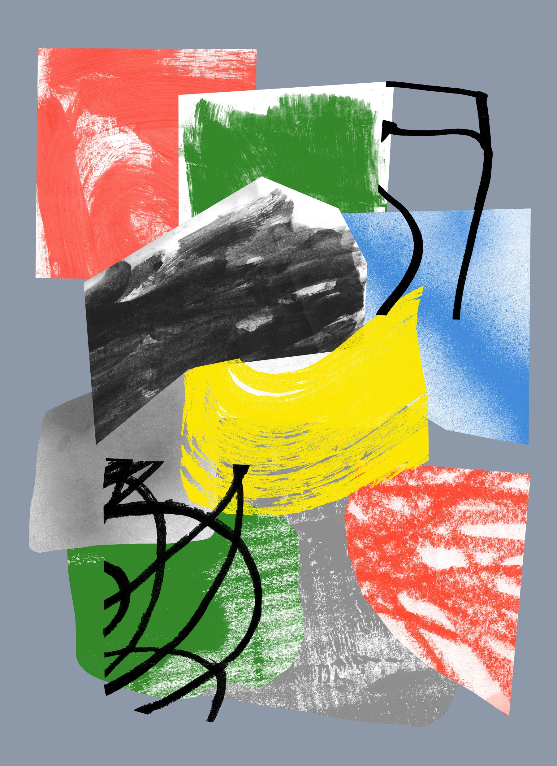 Color-blocked wallpaper with expressive strokes of red, blue, green, and yellow layered over textured shapes.