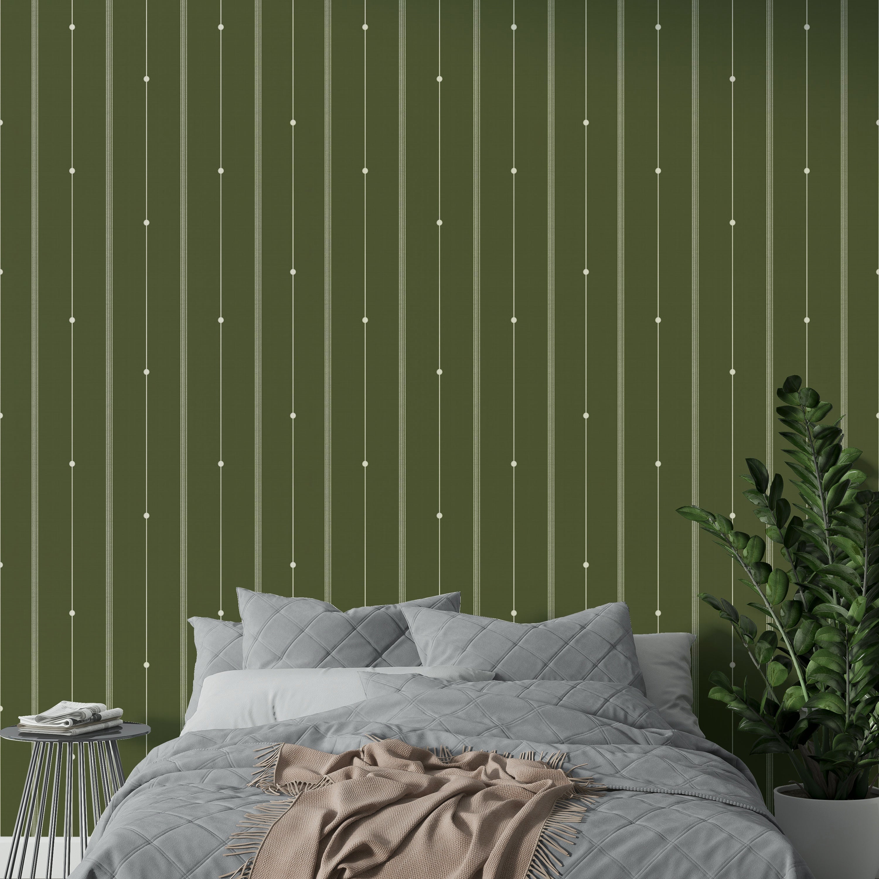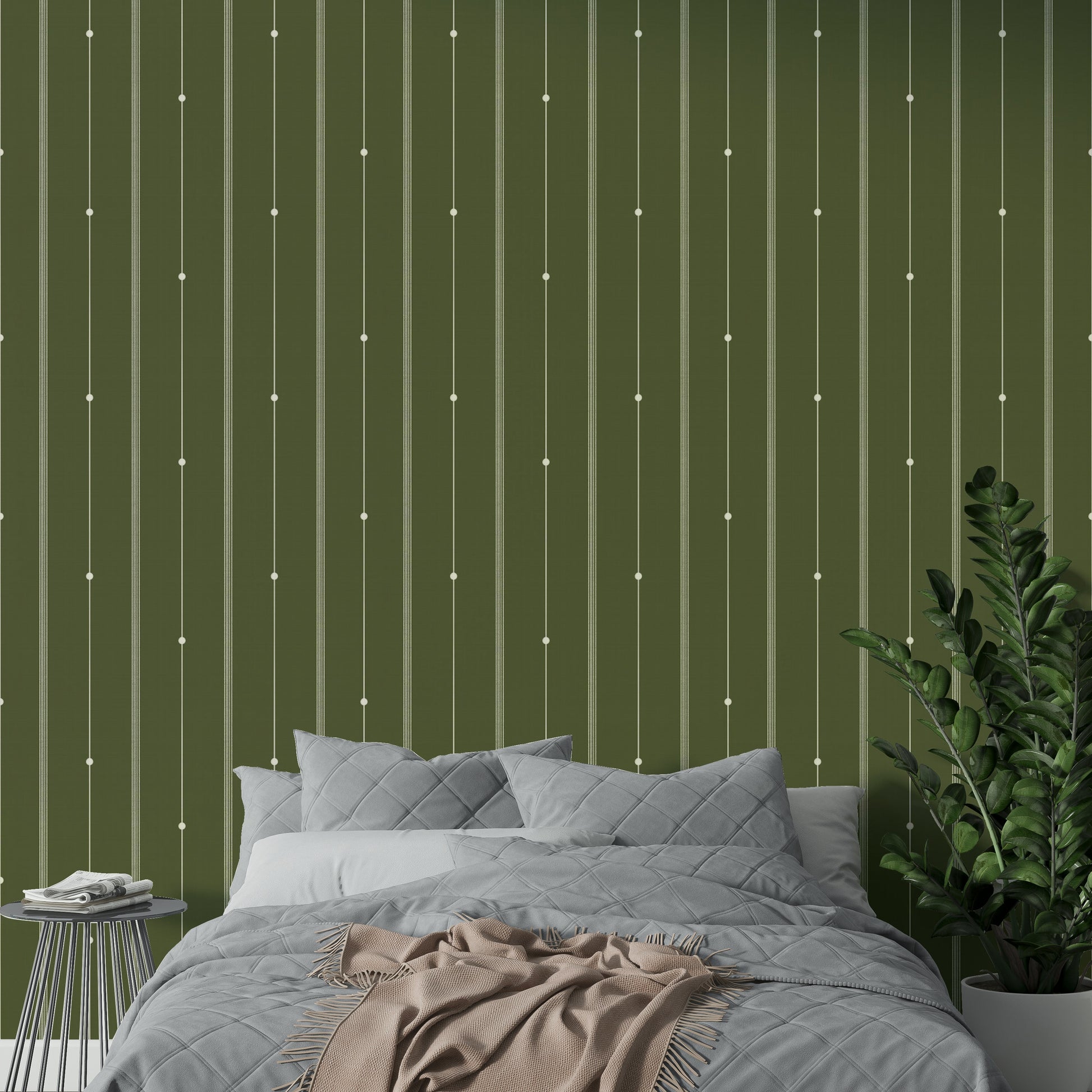 Experience understated elegance with this "Refined Minimal Stripes Olive Drab" wallpaper. A sophisticated palette of olive drab green provides a calming backdrop, punctuated by delicate, off-white vertical stripes and subtly placed circles. The minimalist design creates a sense of serene order and timeless style, perfect for adding a touch of quiet sophistication to any space. This wallpaper offers a refined texture and a calming visual rhythm, ideal for bedrooms, living rooms, or home offices seeking a peaceful and stylish atmosphere. The muted tones and simple pattern ensure a versatile design that complements various interior styles.