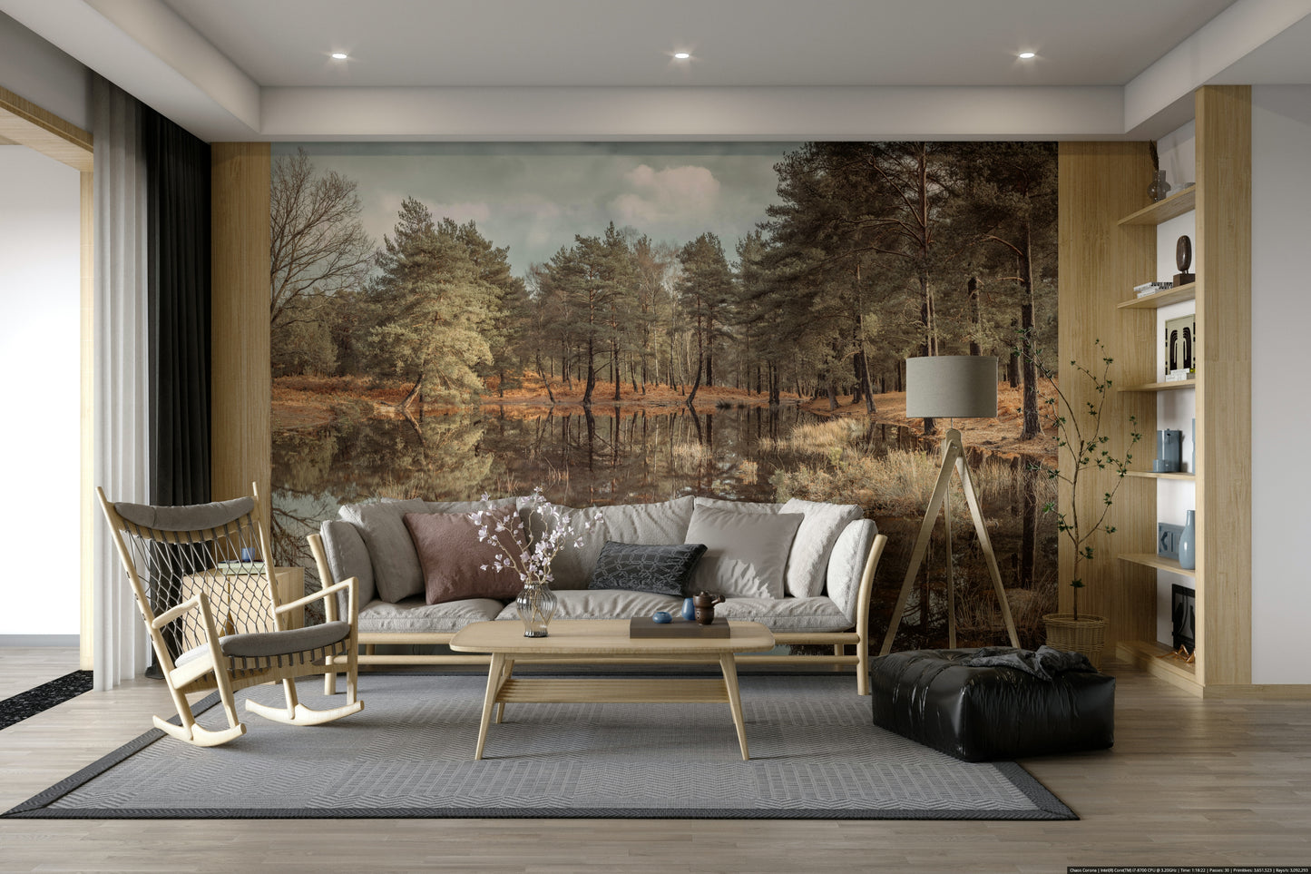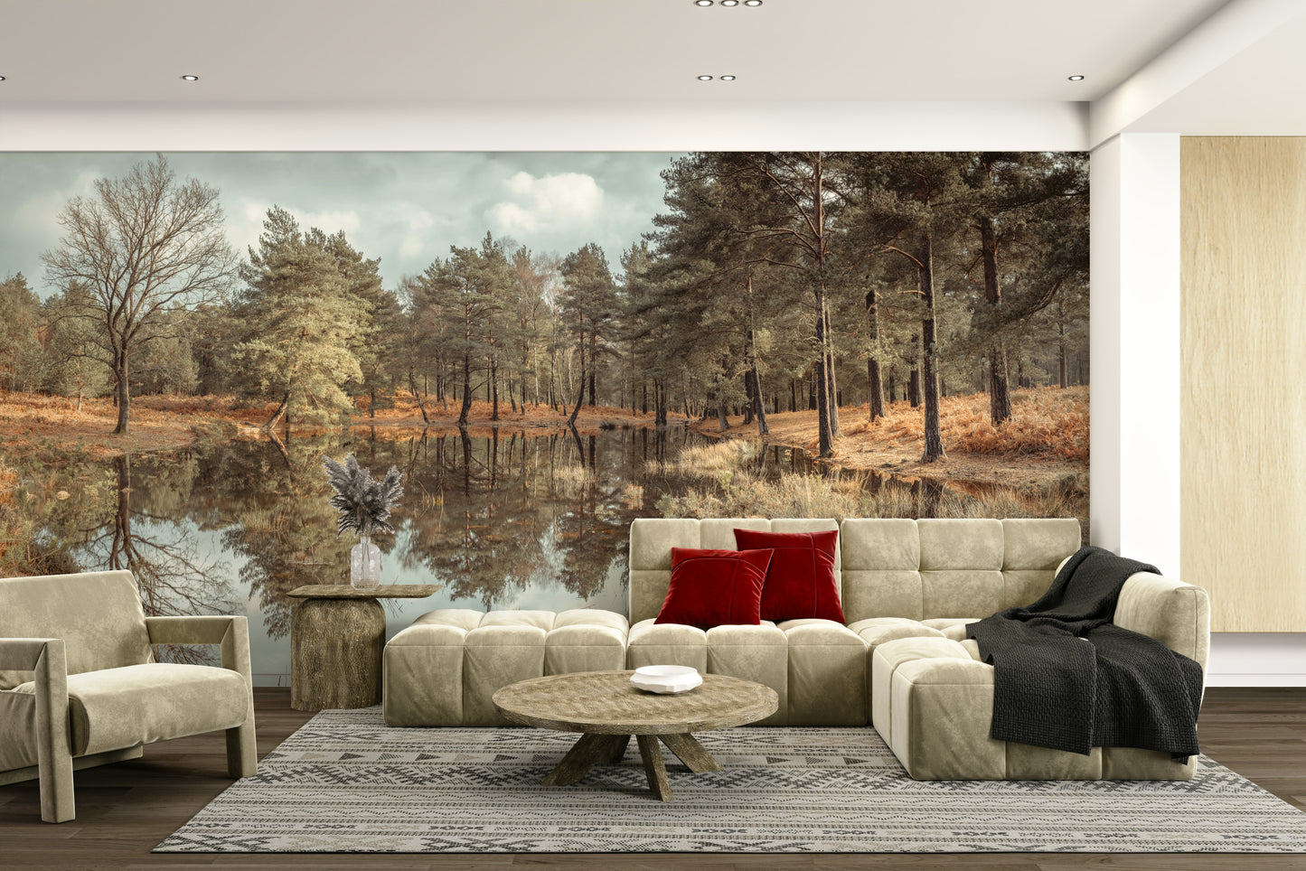 Trees by a lake. Bring a calming forest vista into your home with this wallpaper for walls. The serene image showcases a tranquil lake mirroring the surrounding trees under an overcast sky. The natural tones of brown, green, and gray create a peaceful mood. This design works beautifully in a living room, bedroom, or office, lending a touch of nature to your interior. The reflective quality adds depth, making any space feel more expansive and serene.