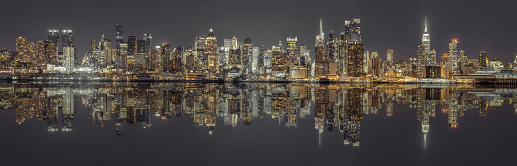 Perfect reflection of the skyline on still water.