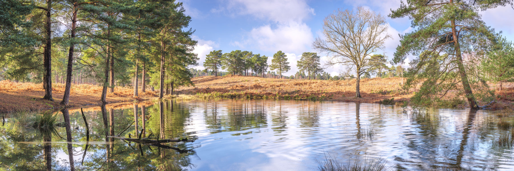 This wallpaper captures the tranquil beauty of a serene woodland pond. The still water acts as a mirror, perfectly reflecting the surrounding pine trees, a solitary bare oak, and the soft autumnal hues of the landscape. Sunlight filters through the branches, creating a warm and inviting atmosphere. The image evokes a sense of peace and quietude, ideal for creating a calming and relaxing ambiance in any room. The subtle interplay of light and shadow adds depth and visual interest, making it a stunning and captivating addition to your digital space.