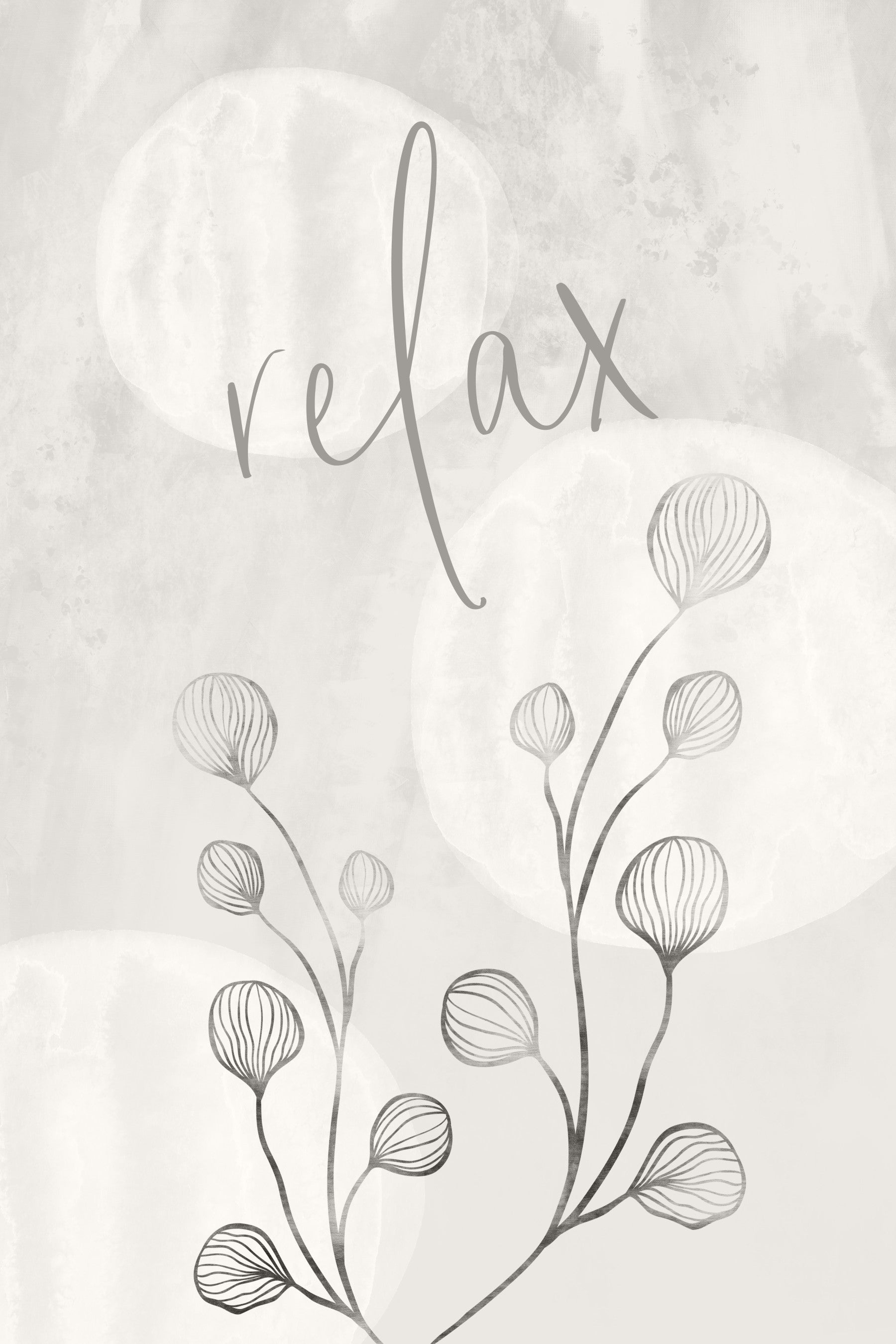 Embrace serenity with this "Relax - Japandi Style" wallpaper. A minimalist design featuring the word "relax" in flowing script gracefully placed above delicate, stylized floral branches. The soft, neutral color palette creates a sense of calm and tranquility, while the watercolor-like textures add subtle depth and visual interest. This wallpaper embodies the Japandi aesthetic—the harmonious blend of Japanese minimalism and Scandinavian warmth. It's perfect for creating a peaceful and inviting atmosphere in any room, encouraging moments of mindfulness and reflection.