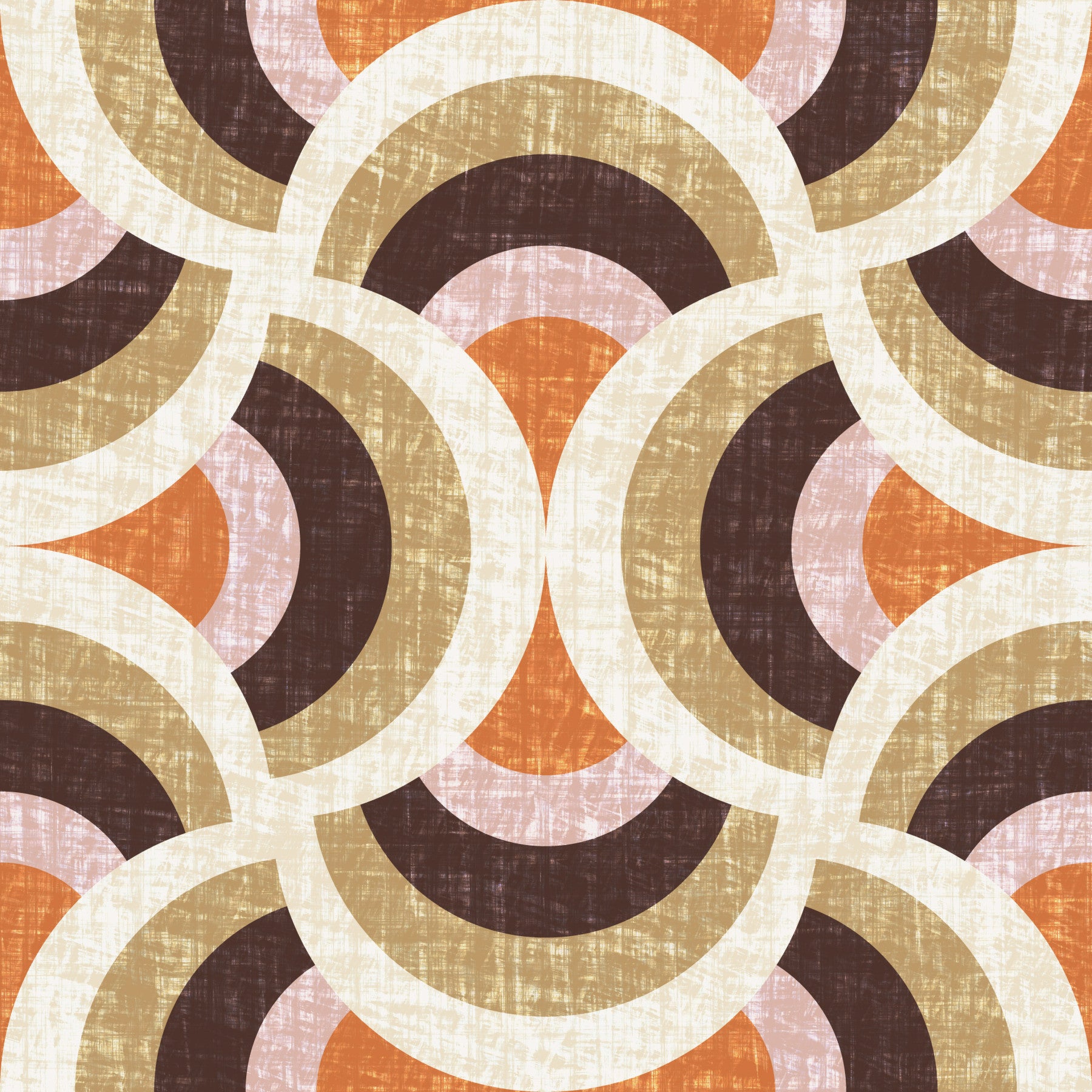 This wallpaper for walls features a classic retro design with concentric arcs that create a dynamic geometric pattern. Warm earth tones like orange, brown, beige, and cream blend together with a textured effect. The design would complement living rooms, bedrooms, or even hallways. Its timeless style gives any room a touch of vintage charm and cozy comfort. It adds character to modern or traditional interiors.