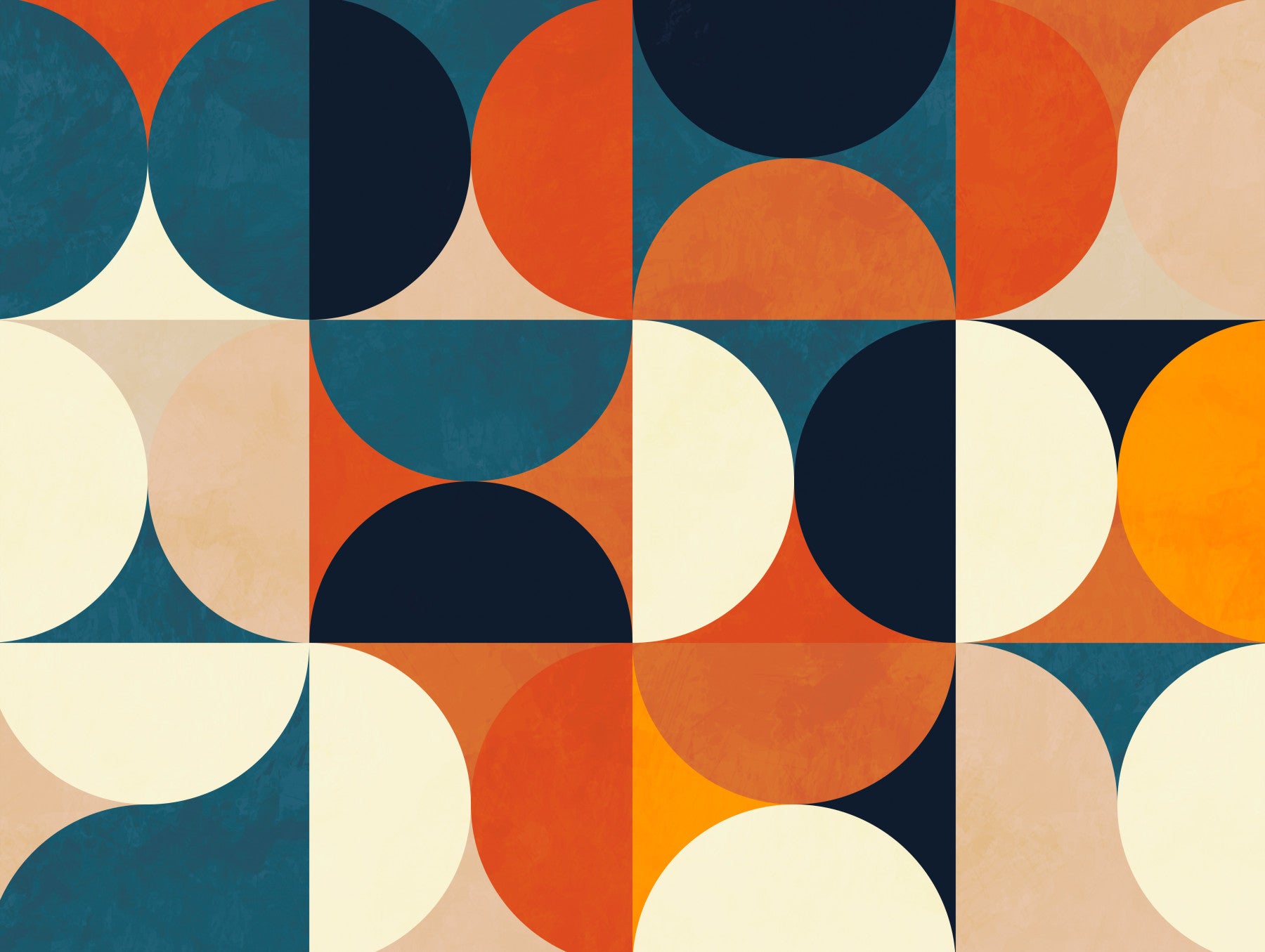 This wallpaper features a geometric pattern with interlocking arcs and circles in bold retro colors. Teal, navy, orange, and beige combine for a stylish, mid-century modern aesthetic. The design creates a lively yet balanced feel, making it ideal for a living room, dining room, or home office. Elevate your interiors with this unique wallpaper for walls. It enhances any room with its geometric precision and cheerful palette.