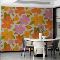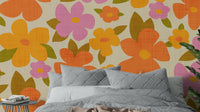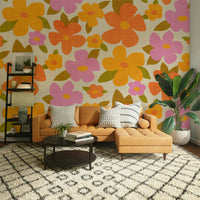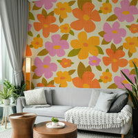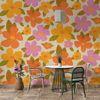 Beautiful bright retro floral print with large colorful abstract flowers in warm positive colors - pink, orange, yellow. Brings joy and cheerfulness to any room. The bold botanical design is full of life and happy color, with a retro look that will bring out the character in your home. Whether you want to create an accent wall or cover the entire room, this wallpaper can bring a unique and stylish touch, and will make any room feel warmer and sunnier.