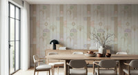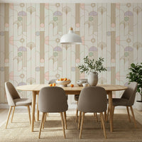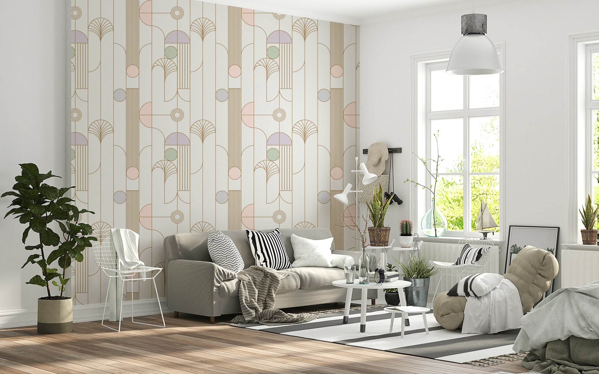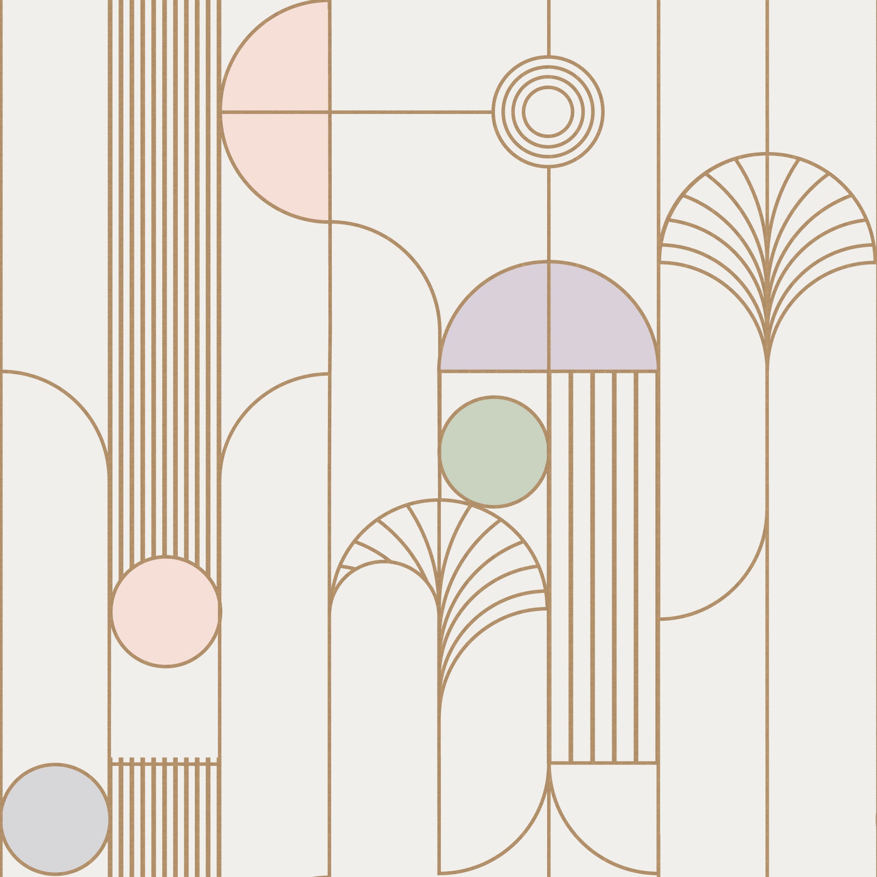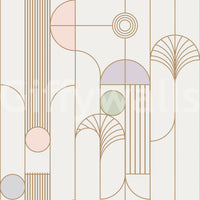 Evoke the glamour of a bygone era with this Retro Chic Art Deco wallcovering. A modern interpretation of classic Art Deco design, this pattern features stylised geometric shapes and clean lines, reminiscent of the roaring twenties. Imagine the sophistication it brings to your walls with a subtle interplay of form and colour. Golden outlines define the pastel shapes of rose, mint, lavender, and ash grey, creating a visually striking contrast against the pale neutral background. The symmetrical yet fluid layout, with its subtle vertical patterns, adds a touch of sophistication and creates a striking impact that elevates any space. This design will transform any space into a chic sanctuary. Perfect for bedrooms, living rooms, or any space craving a touch of vintage charm.