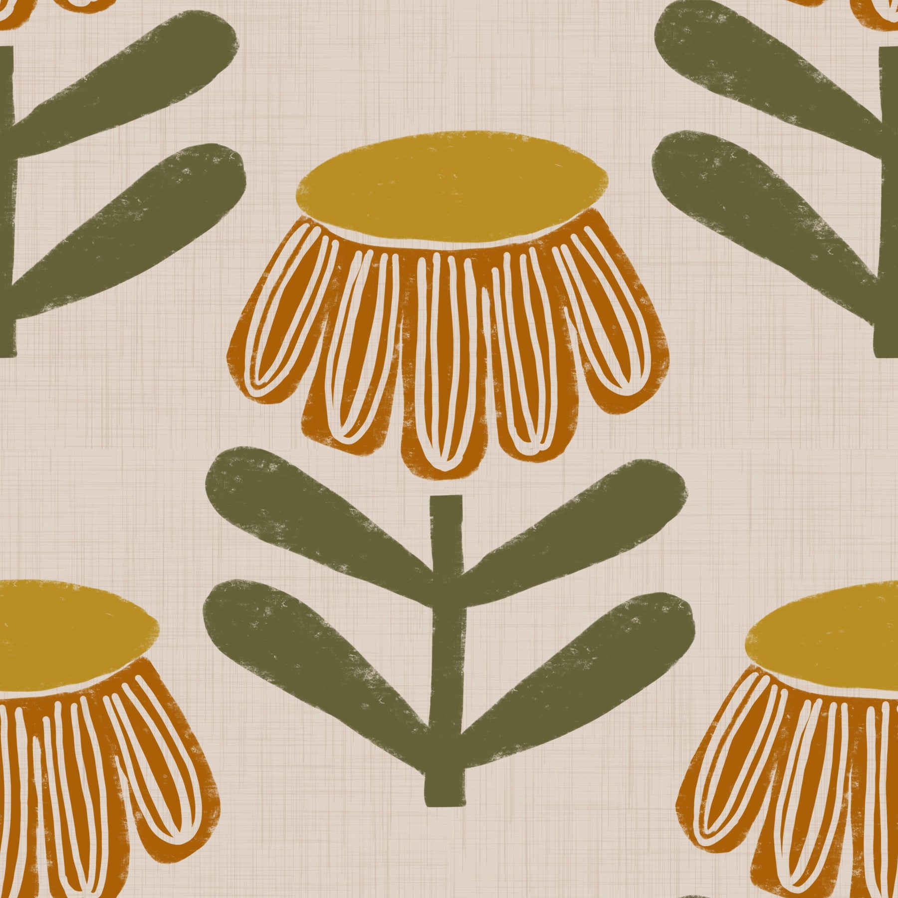 Embrace mid-century modern style with this captivating wallpaper featuring stylized daisies in a warm, earthy palette. The design blends retro aesthetics with a contemporary feel, showcasing bold mustard yellow and burnt orange flower heads contrasted against muted olive green leaves. Each daisy is meticulously rendered with simplified, yet expressive lines, creating a visually striking and harmonious pattern on a textured beige background. This wallpaper evokes a sense of calm sophistication, perfect for adding a touch of vintage charm to any space. The repeating pattern ensures a seamless and pleasing aesthetic for both large and small areas, lending a unique and stylish backdrop to your digital devices.
