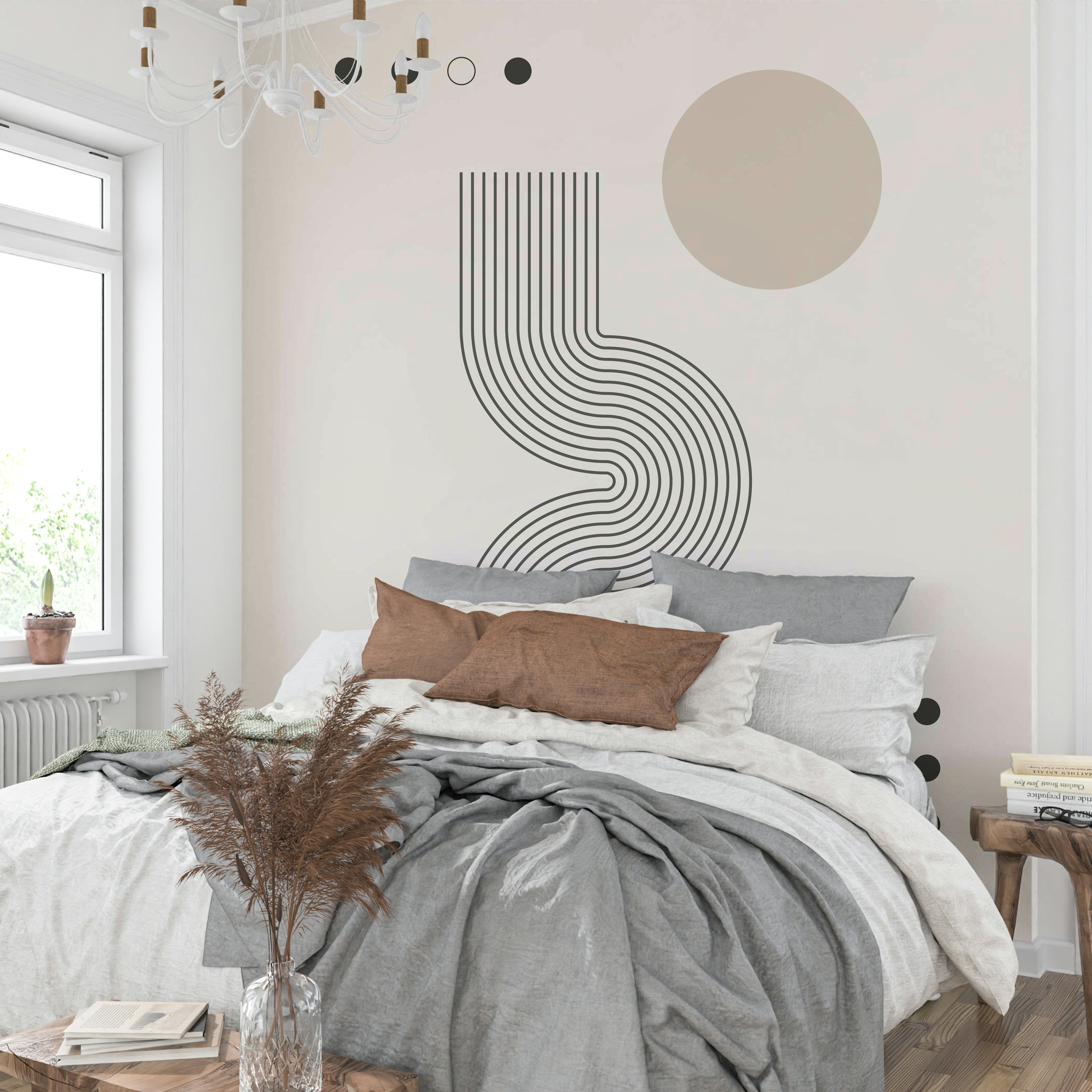 Embrace a sense of calm with this "Retro Geometric Flow" wallpaper. Clean lines and a muted color palette create a minimalist yet captivating design. Parallel lines gracefully curve and flow, creating a dynamic visual rhythm reminiscent of 70s design aesthetics. Subtle circles punctuate the composition, adding a touch of playful asymmetry against the soft neutral background. This wallpaper exudes sophistication and tranquility, making it a perfect choice for those seeking a sophisticated and calming backdrop for their space.