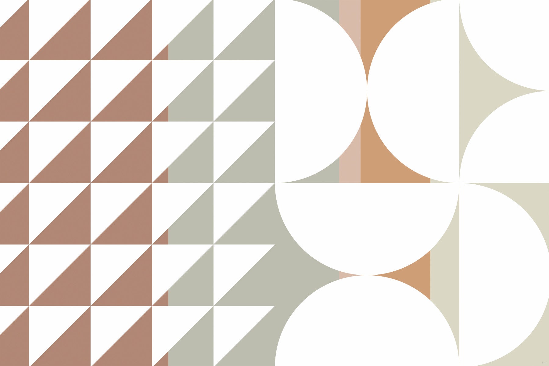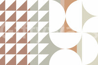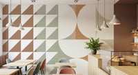 This geometric wallpaper features triangles and circles in a harmonious blend of beige, terracotta, and light grey. It brings a touch of mid-century modern style to any space. Use it in a living room to create a relaxing atmosphere or in a home office for a stylish touch. Its refined design offers visual appeal, making it a timeless choice for wallpaper for walls. The soft colour palette lets it pair nicely with modern furniture and minimalist decor.