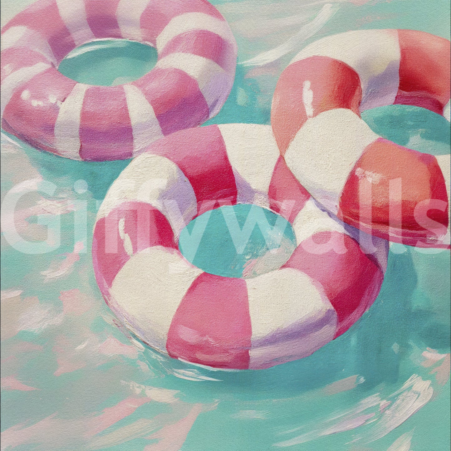 Dive into a pastel dream with this vibrant wallpaper. Three life preservers, adorned in pink and white stripes, float serenely on a turquoise surface, evoking a sense of carefree summer days. The painterly brushstrokes and soft hues create a retro-inspired aesthetic, perfect for adding a touch of nostalgia and joy to any space. Ideal for a bathroom, kid's room, or anywhere you want to infuse a playful and calming vibe. Feel the summer sun with this vintage, charming design.