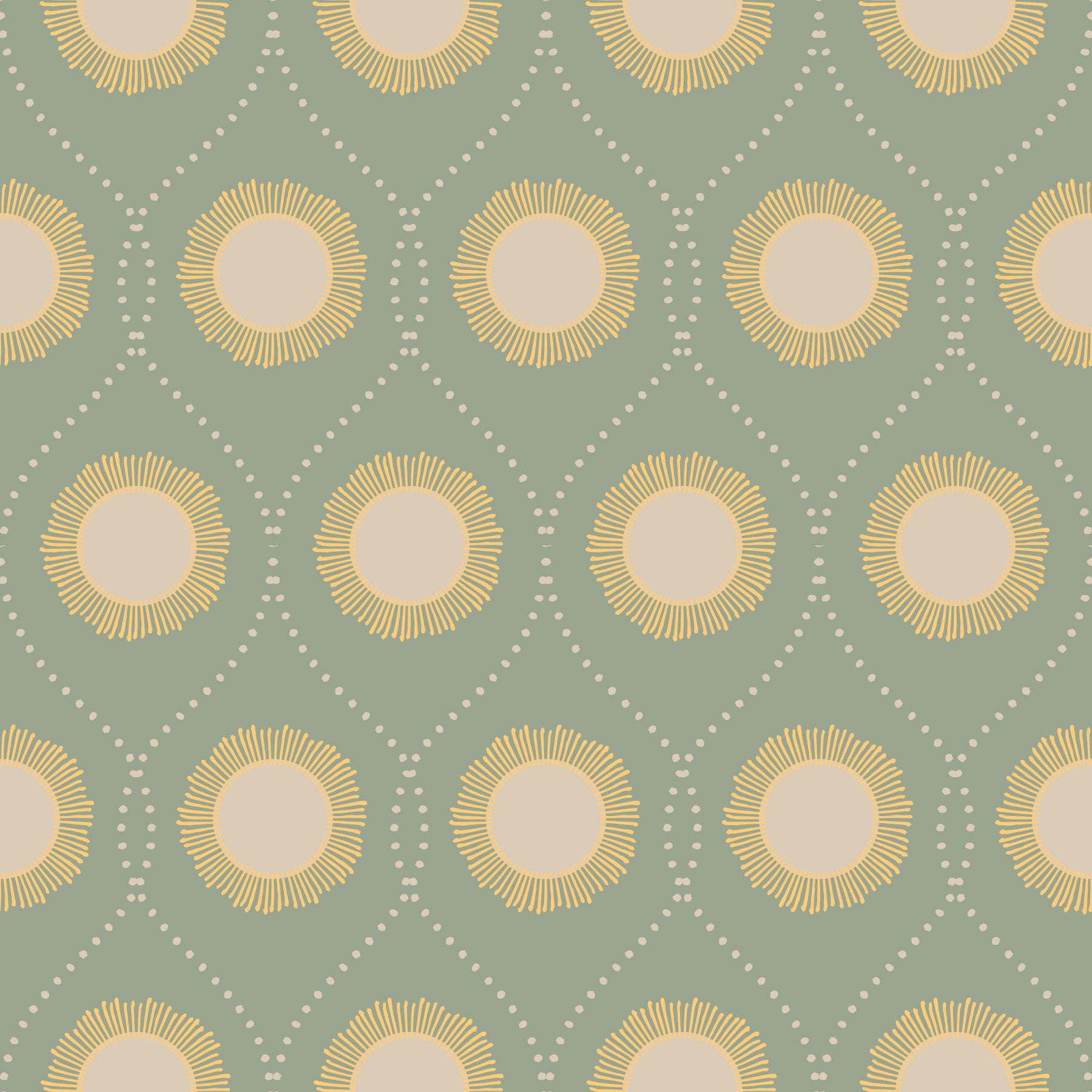 Sage green wallpaper with delicate beige dot pattern, Retro Radiance suns.