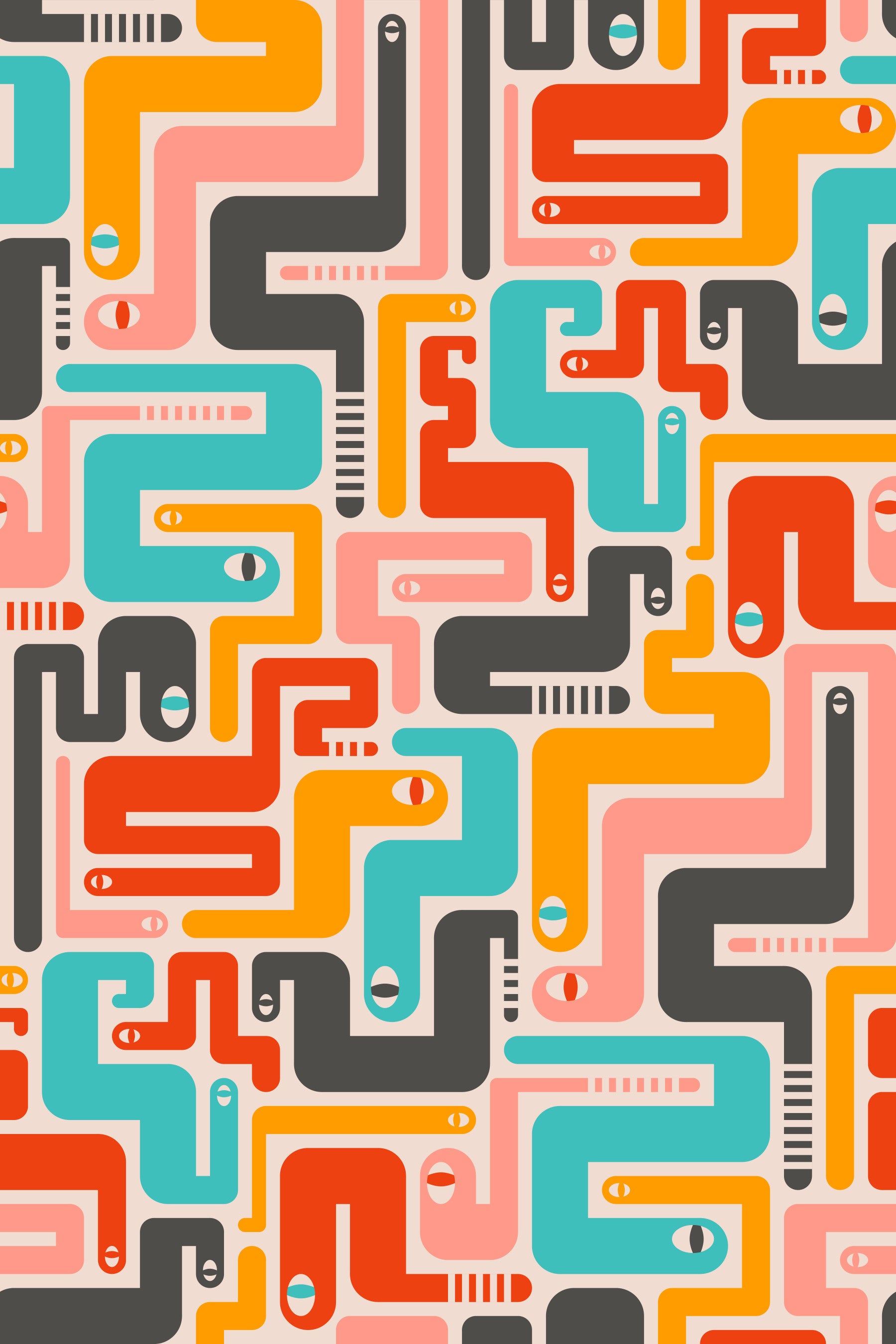 Venture into the vibrant world of Retro Rattlers a Mid-Century Modern wallpaper that slithers with playful sophistication. This eye-catching design features bold stylized geometric snakes rendered in a lively color palette of dark gray, yellow, pink, red, and turquoise. The retro aesthetic invokes the spirit of 1950s Palm Springs style with clean lines and a focus on form, making it a standout choice for any modern interior. Perfect for adding a touch of vintage charm and a dash of playful intrigue, “Retro Rattlers” transforms your walls into a captivating piece of art. Embrace the allure of the desert with this refreshingly modern take on a classic motif. This pattern design is also available in Other Colourways too! Original wallpaper pattern design by Jackie Tahara of UnBlink Studio.