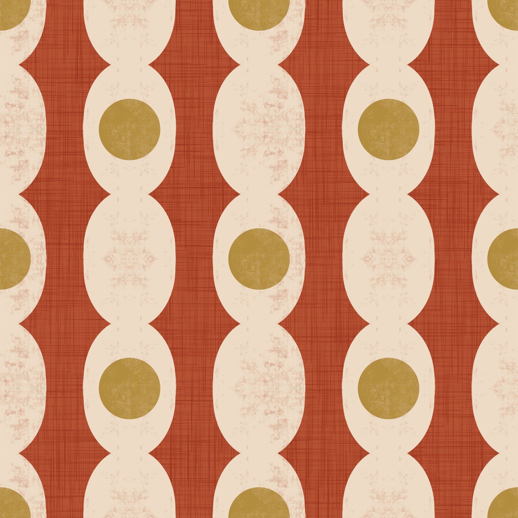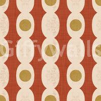 Enhance your space with this retro-inspired pattern. Beige rings and mustard circles link across a terracotta backdrop. This wallpaper for walls creates a stylish, repeating design. The design provides a warm ambiance for interiors. It offers a clean and simple style. It suits living rooms, dining areas, or hallways. The colour combination makes spaces inviting. This wallpaper works well with mid-century modern and bohemian decor. Transform any room with a touch of retro charm.