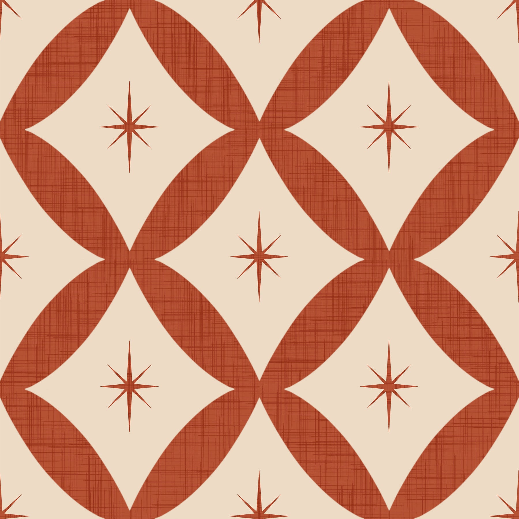 Warm retro wallpaper featuring terracotta diamond tiles and atomic-inspired stars.