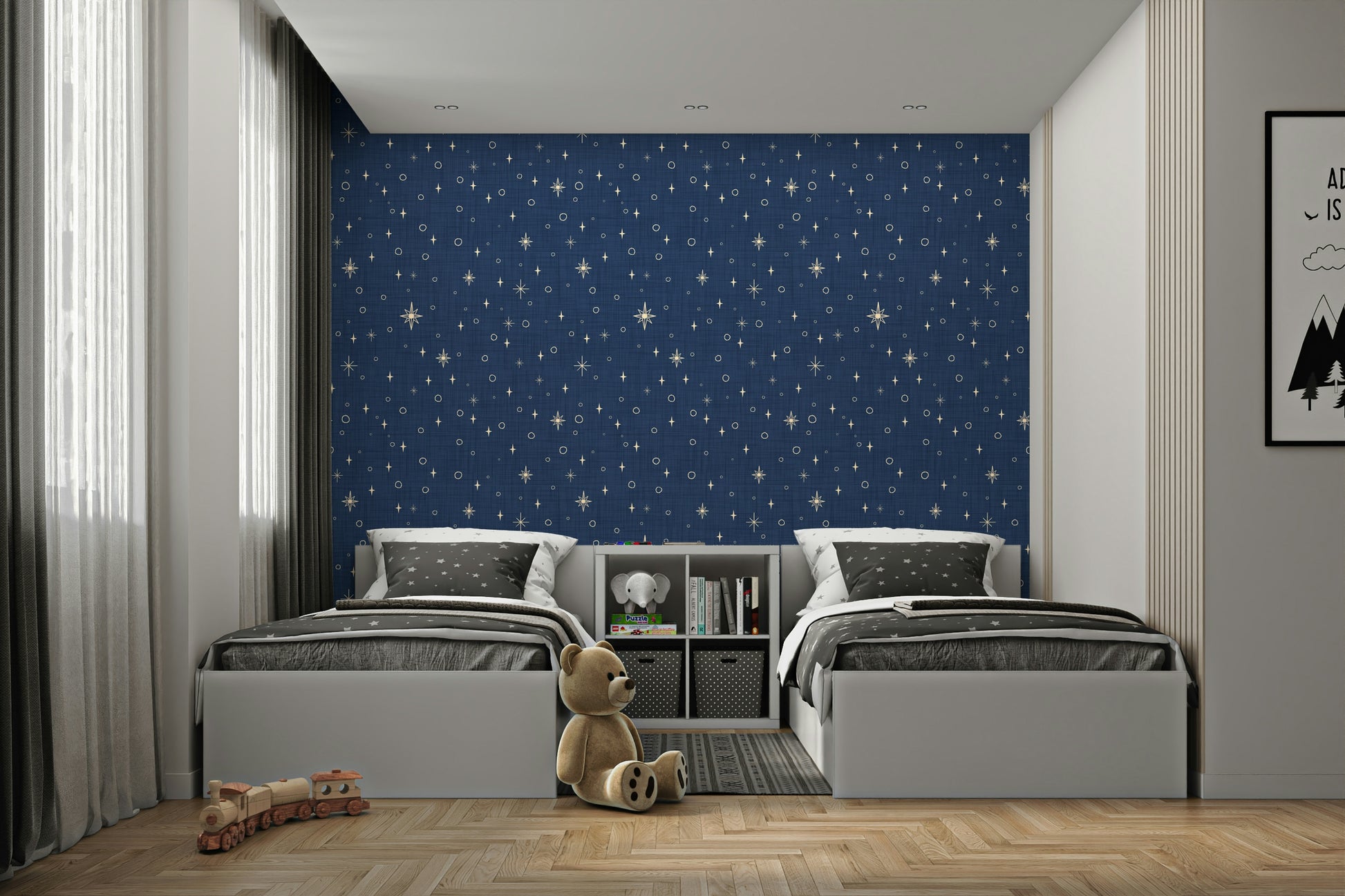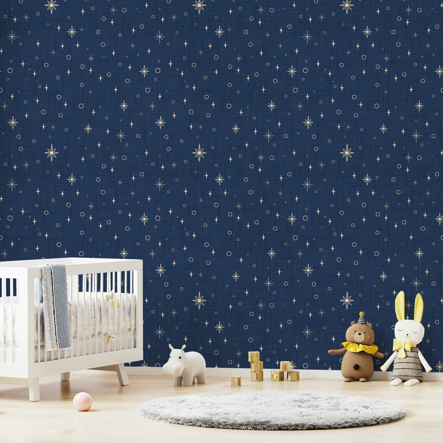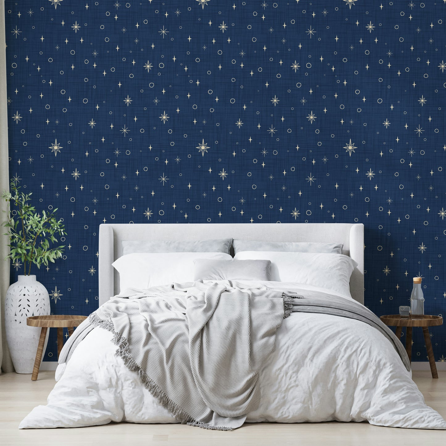 Embark on a celestial journey with this retro-inspired wallpaper, reminiscent of vintage nautical charts under a starlit sky. The deep blue backdrop, textured with a subtle linen-like weave, evokes the vast ocean depths. Scattered across this midnight canvas are stylized stars in warm, burnt amber hues, from simple crosses to intricate multi-pointed designs. Tiny, minimalist circles punctuate the design, creating a whimsical, retro feel. This pattern offers a calming and sophisticated aesthetic, perfect for creating a unique and inviting space, blending classic nautical charm with a touch of mid-century modern flair.