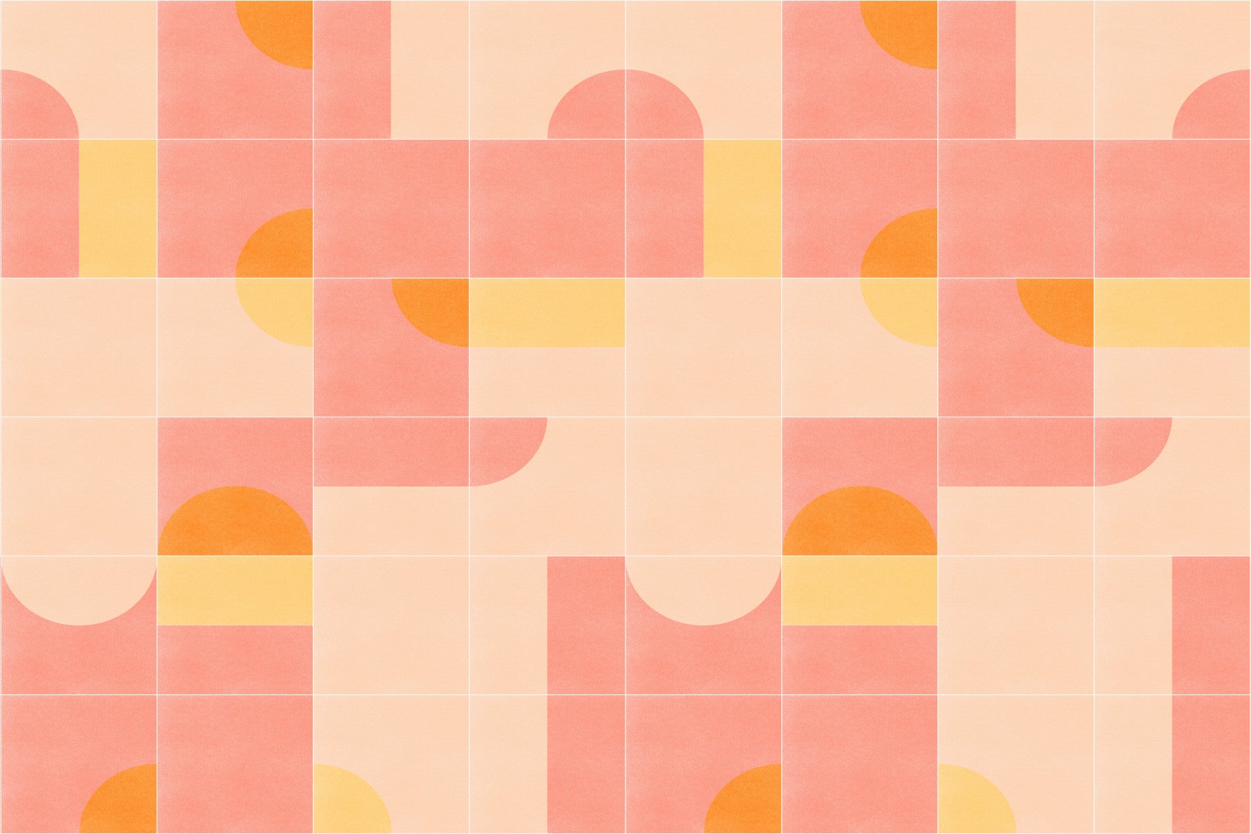 Step back in time with Retro Tiles 02 a wallpaper that brings the warmth and geometric charm of mid-century modern design to your digital space. This delightful pattern features a grid of interlocking squares in a soothing palette of peach, salmon, and sunshine yellow. Bold, confident semi-circles add a playful dynamic, creating a visually engaging yet calming aesthetic. The subtle texture lends depth and tactility, giving the impression of handcrafted tiles. 'Retro Tiles 02' is perfect for anyone seeking a touch of vintage sophistication with a contemporary twist. Transform your screen into a retro haven and infuse your day with a burst of optimistic energy. Perfect for adding a stylish, nostalgic touch to any device.
