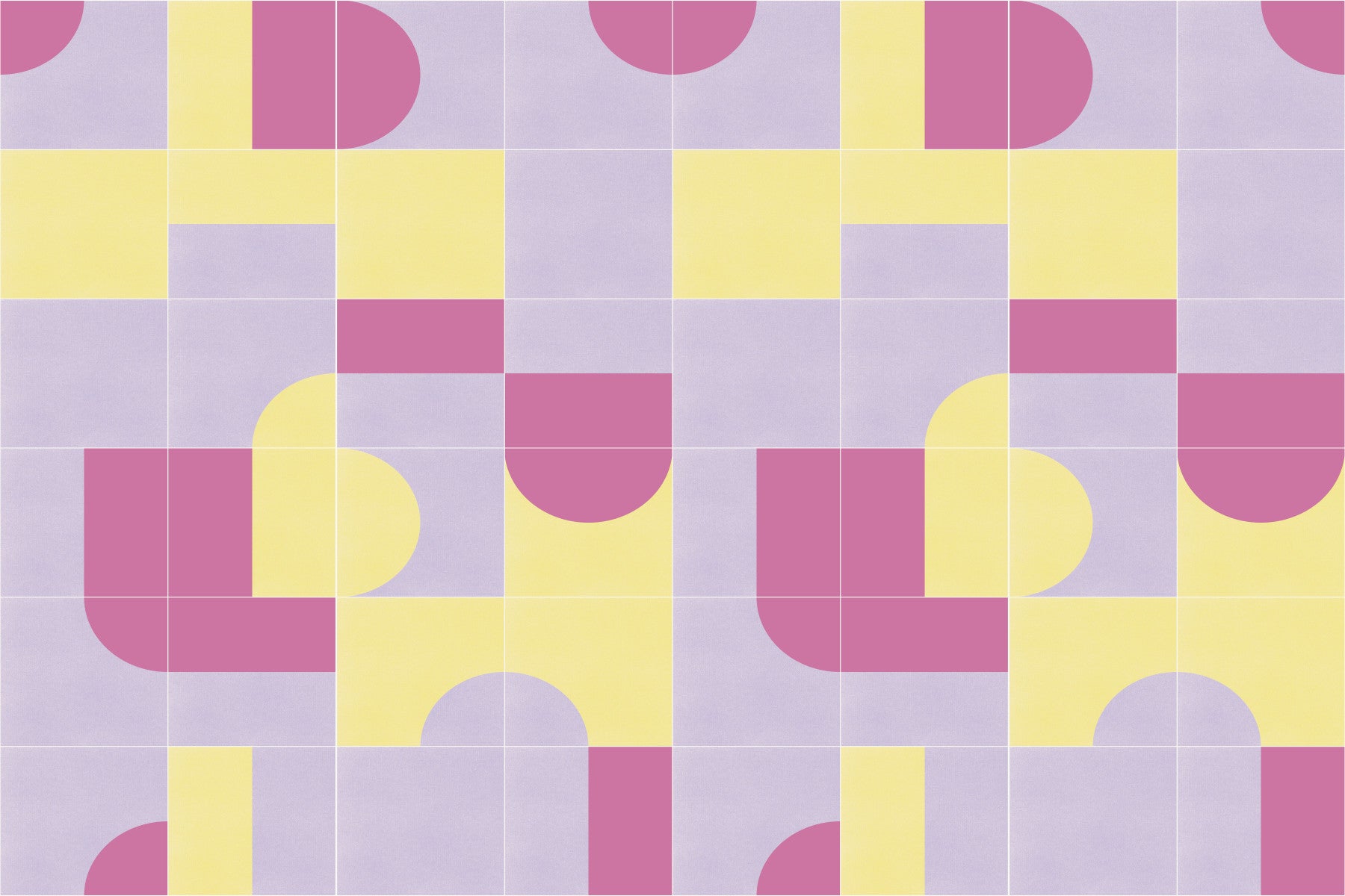 Step back in time with Retro Tiles 08 a delightful wallpaper that encapsulates the essence of mid-century modern design. This pattern features a playful arrangement of geometric shapes - squares and half-circles – presented in a refreshing palette of pastel lavender, sunshine yellow, and muted rose. The deliberate use of clean lines and a grid-like structure evokes a sense of order and balance, characteristic of retro aesthetics. The subtle texture adds depth and character, reminiscent of vintage textiles and handcrafted ceramics. "Retro Tiles 08" is perfect for adding a touch of nostalgic charm and understated elegance to any space, creating a calming and visually engaging backdrop for your digital world. This wallpaper is a stylish and versatile choice that will complement a wide range of screen resolutions and personal preferences.