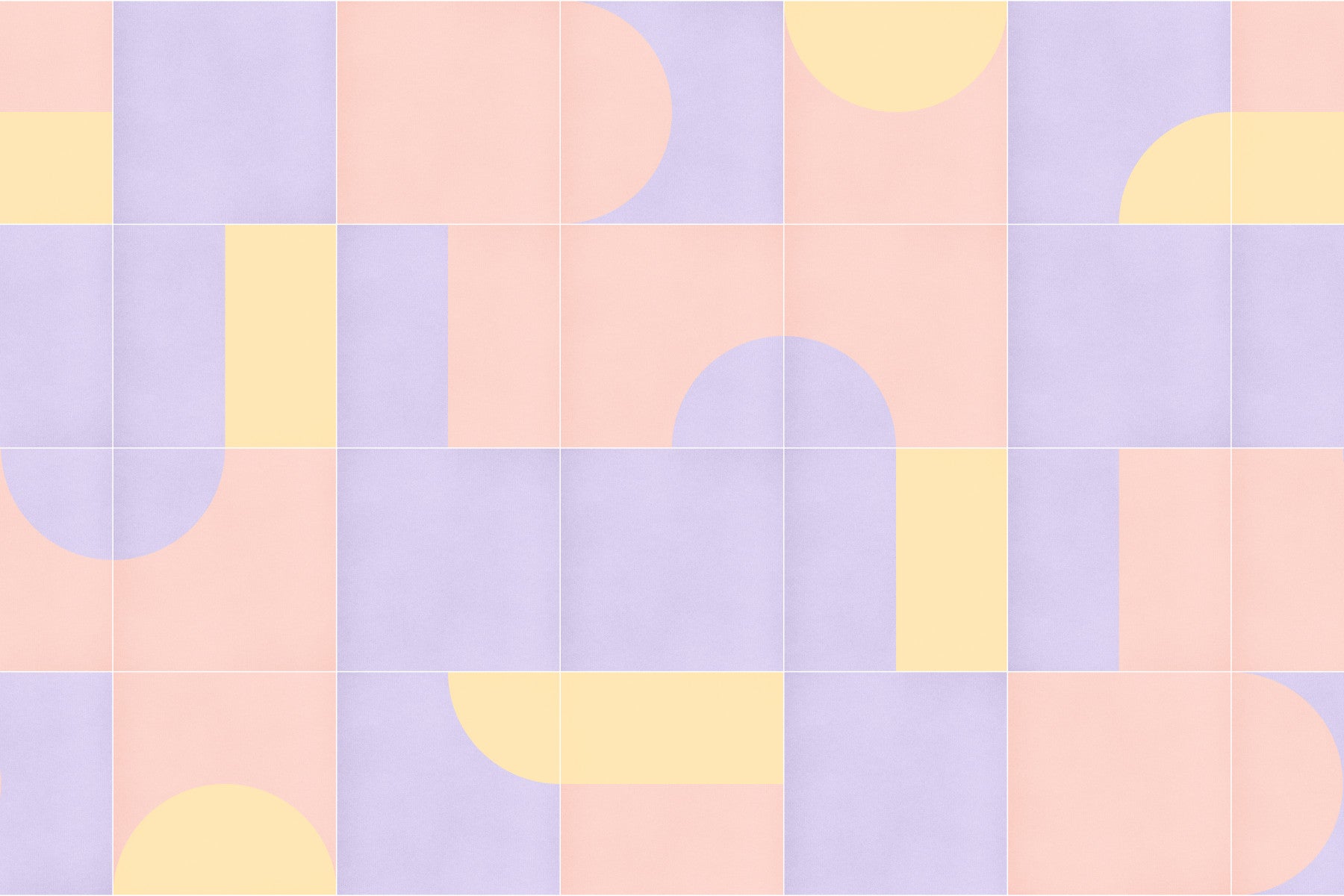 Step back in time with Retro Tiles 18 a wallpaper design that channels the playful geometric aesthetics of the mid-century modern era. This pattern presents a delightful arrangement of pastel hues, blending soft lilac, peach, and buttery yellow in a structured grid of square tiles. Each tile showcases variations of solid colors and elegantly placed semi-circular shapes, creating a balanced yet dynamic visual rhythm. The subtle texture adds a tactile dimension, reminiscent of vintage fabrics and handcrafted art. Embrace the nostalgic charm of "Retro Tiles 18" to infuse your digital spaces with a touch of warmth and understated sophistication, perfect for adding a unique retro flair to your screen. This wallpaper is a timeless classic with a modern twist, sure to bring a smile to your face every time you see it.