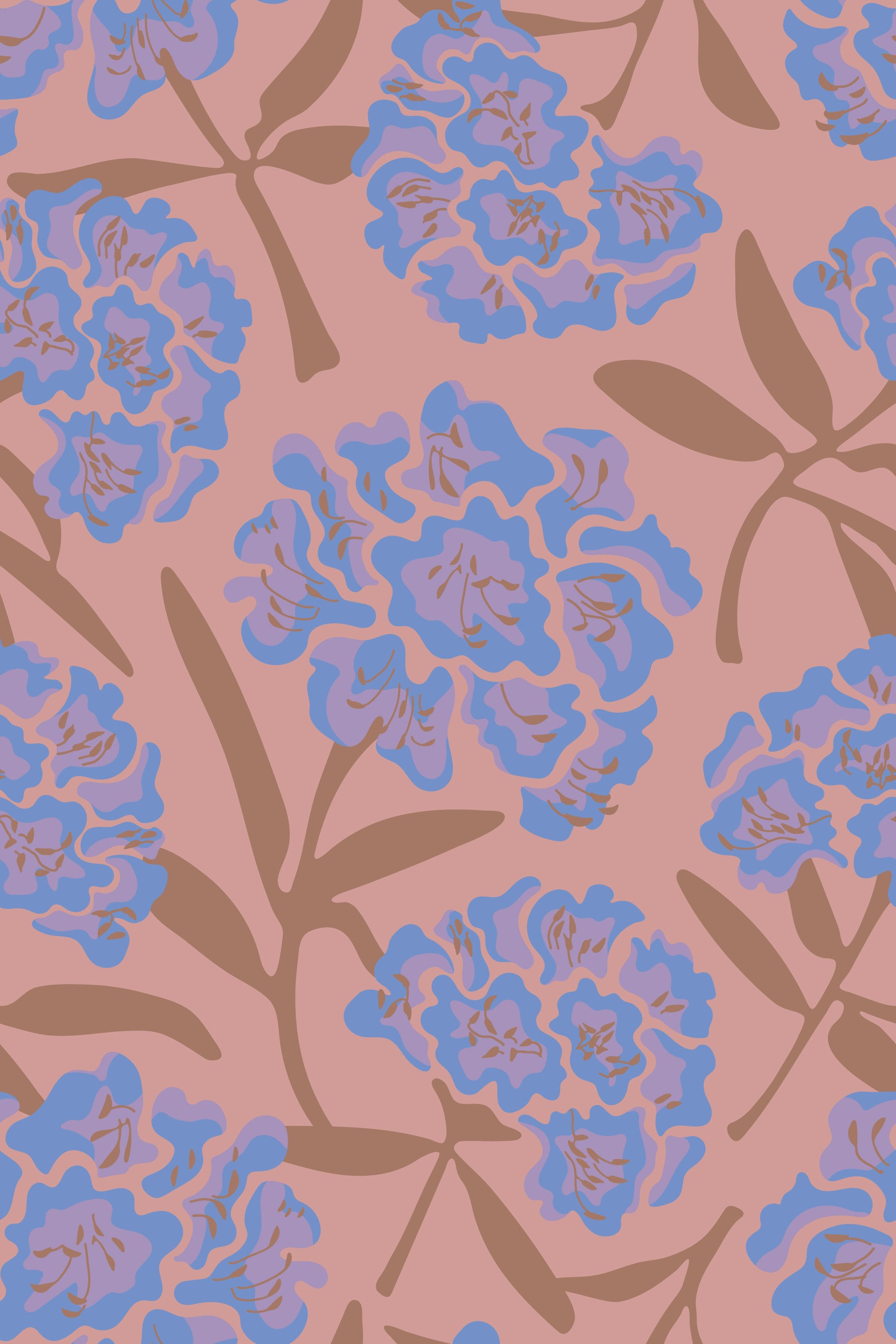 Indulge in the serene beauty of "Rhododendrons Floral Mocha Mousse Blue Violet Rose Pink." This wallpaper showcases a captivating pattern of stylized rhododendrons, rendered in a soft palette of Cornflower Blue, Violet and Mocha Mousse Brown on Rose Pink, creating a sophisticated and tranquil ambiance. The elegant floral design is subtly detailed with organic lines and shapes, evoking a sense of calm and understated luxury. Perfect for adding a touch of botanical charm. This pattern design is also available in Other Colourways too! Original wallpaper pattern design by Jackie Tahara of UnBlink Studio.