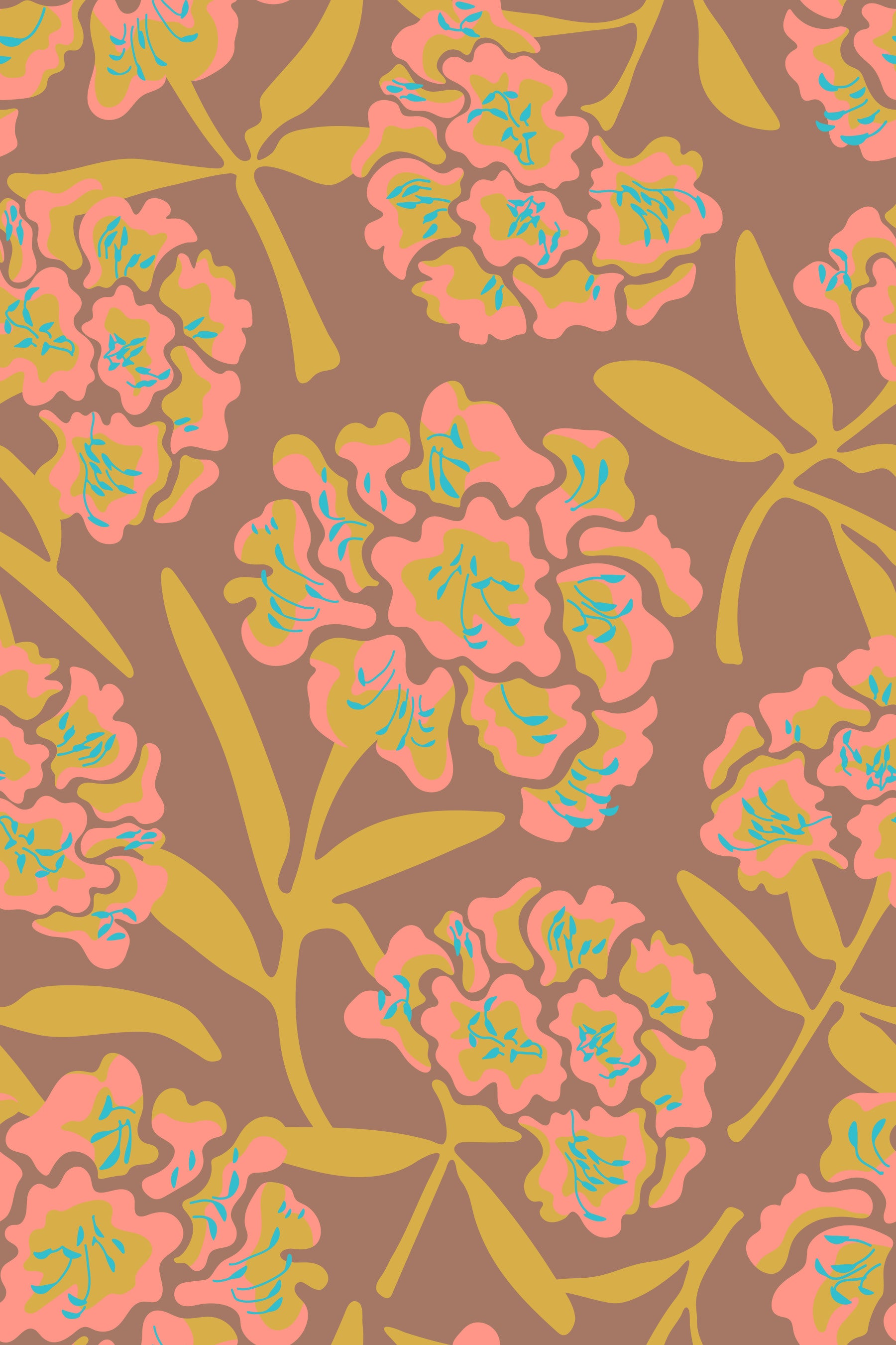 Embrace a vintage vibe with this stunning wallpaper featuring stylized rhododendrons in a captivating color palette. Blush Pink and Mustard Yellow blossoms dance across a warm Mocha Mousse Brown background, creating a retro floral design that's both sophisticated and playful. The simplified, yet elegant, floral shapes are accented with pops of Blue, adding a touch of unexpected vibrancy. This wallpaper offers a unique blend of classic charm and modern design, perfect for adding a touch of bohemian flair to any space. This pattern design is also available in Other Colourways too! Original wallpaper pattern design by Jackie Tahara of UnBlink Studio.