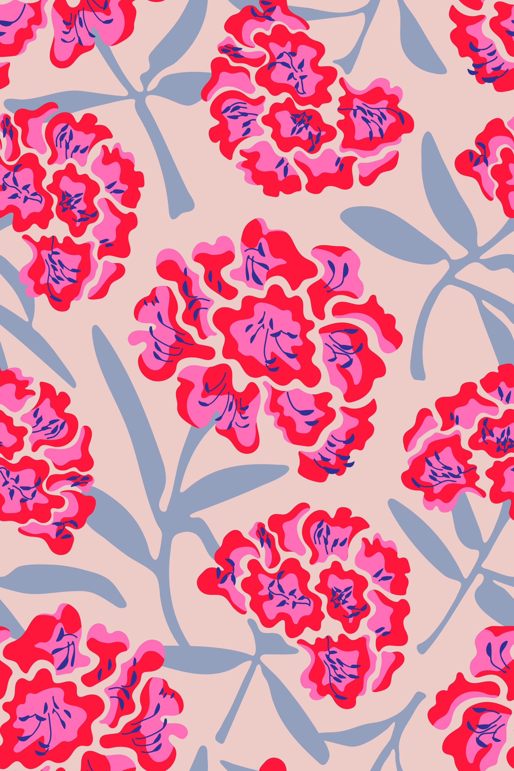 Embrace a vibrant glamorous aesthetic with this captivating wallpaper featuring stylized rhododendrons. Bold and feminine Fuchsia Hot Pink and Bright Red flowers with touches of Royal Blue burst against a soft Blush Pink background. Stems and leaves in pretty Lavender Purple complete the retro floral feel, combining a sense of vintage charm with modern ultra-feminine energy. Add a splash of bold, playful color to your space! This pattern design is also available in Other Colourways too! Original wallpaper pattern design by Jackie Tahara of UnBlink Studio.