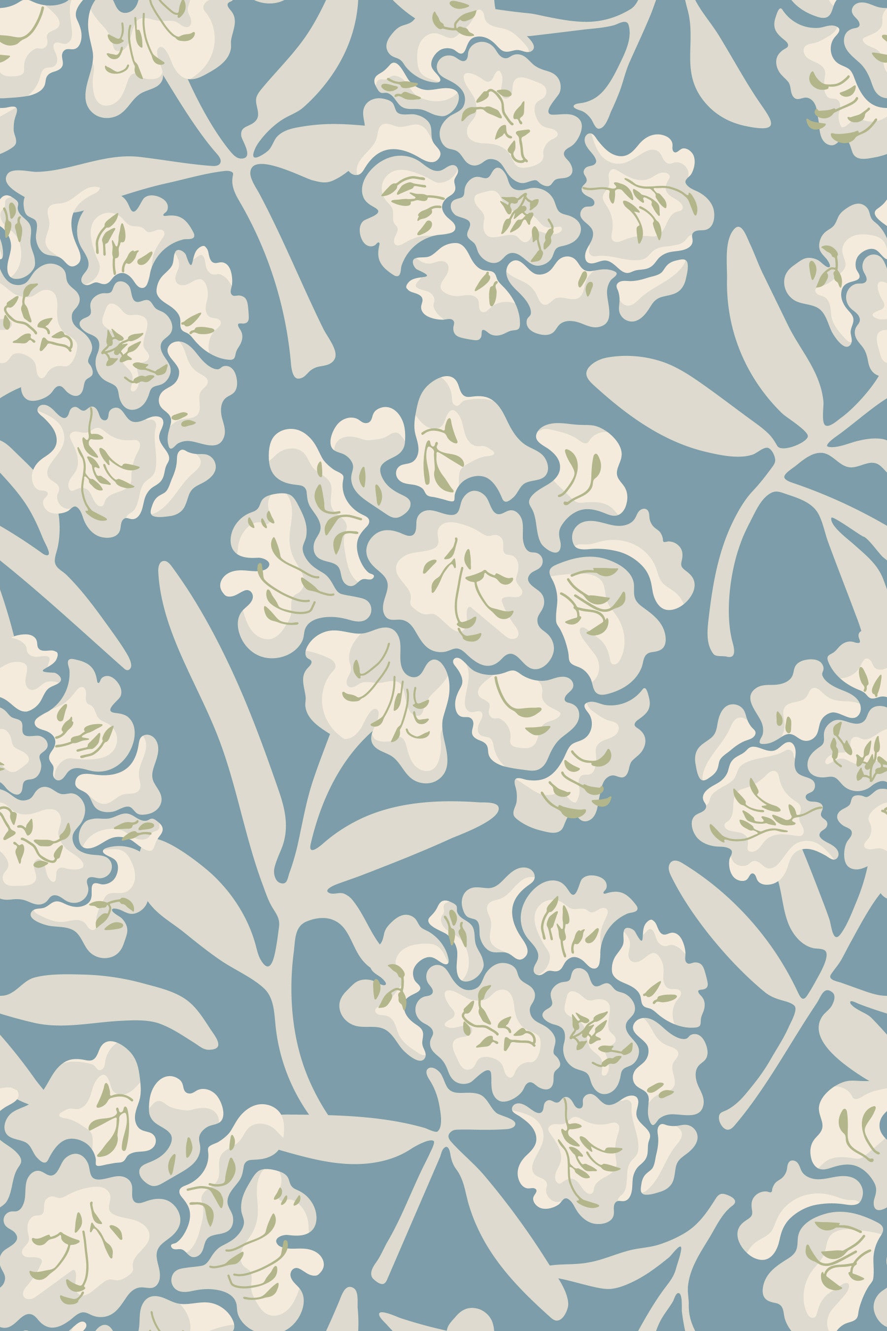 Embrace a serene and stylish atmosphere with this "Rhododendrons Retro Floral White Soft Pastel Blue" wallpaper. The design features a captivating pattern of stylized rhododendrons in White, Gray and Sage Green on a light Soft Pastel Blue background. The retro-inspired floral motif evokes a sense of vintage cottage charm and elegance, while the fresh color palette creates a peaceful and tranquil mood. Delicate, elongated leaves complement the softly rendered blooms, resulting in a wallpaper that's both sophisticated and effortlessly calming, perfect for bedrooms, living rooms, or any space seeking a touch of understated beauty and timeless appeal. This pattern design is also available in Other Colourways too! Original wallpaper pattern design by Jackie Tahara of UnBlink Studio.