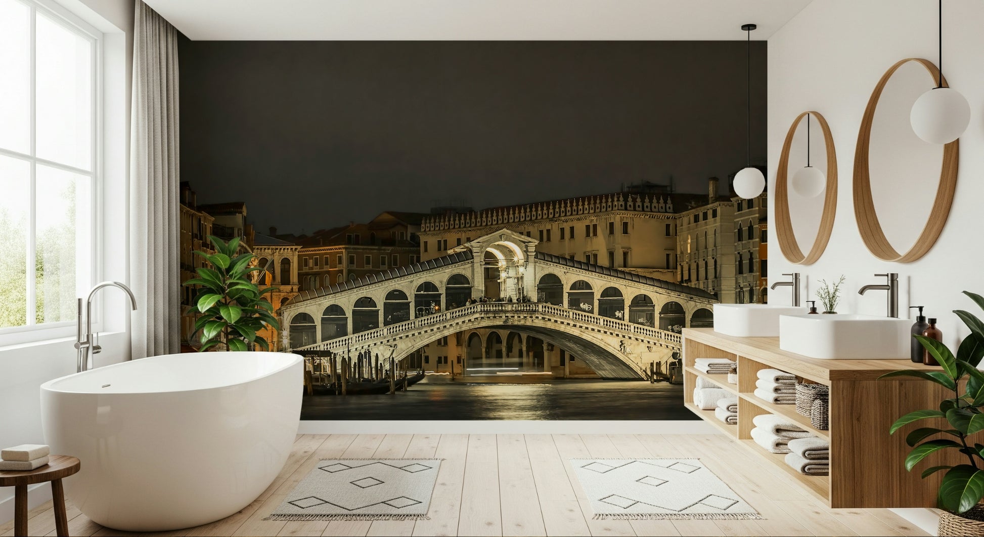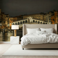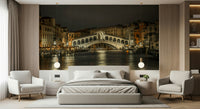 The grand canal and the Rialto bridge at night, Venice, Italy. This breathtaking wallpaper for walls captures Venice's iconic Rialto Bridge at night. The illuminated landmark reflects beautifully on the Grand Canal. Buildings on either side glow with warm light, creating a captivating scene. The design introduces a touch of Italian romance to bedrooms, living rooms, or dining areas. The detailed architecture and serene atmosphere enrich interiors with a sense of history and elegance. Suitable for creating a sophisticated feature wall.