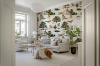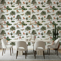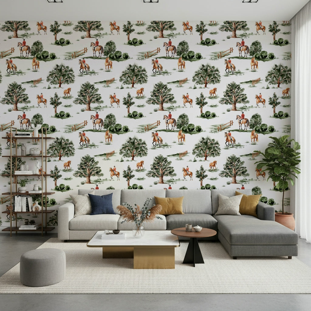 This watercolour-style wallpaper features horses and riders amidst a serene, green landscape by Uta Naumann. The earthy tones and delicate brushstrokes create a peaceful mood. Imagine walls adorned with this scene of riders and horses, inviting a sense of nature into your home. This wallpaper for walls offers a timeless charm perfect for a study, library, or even a dining room, creating a sophisticated atmosphere. The repetitive pattern makes it ideal for larger spaces, adding both depth and a touch of artistic flair. Let it transport you to the tranquil countryside.