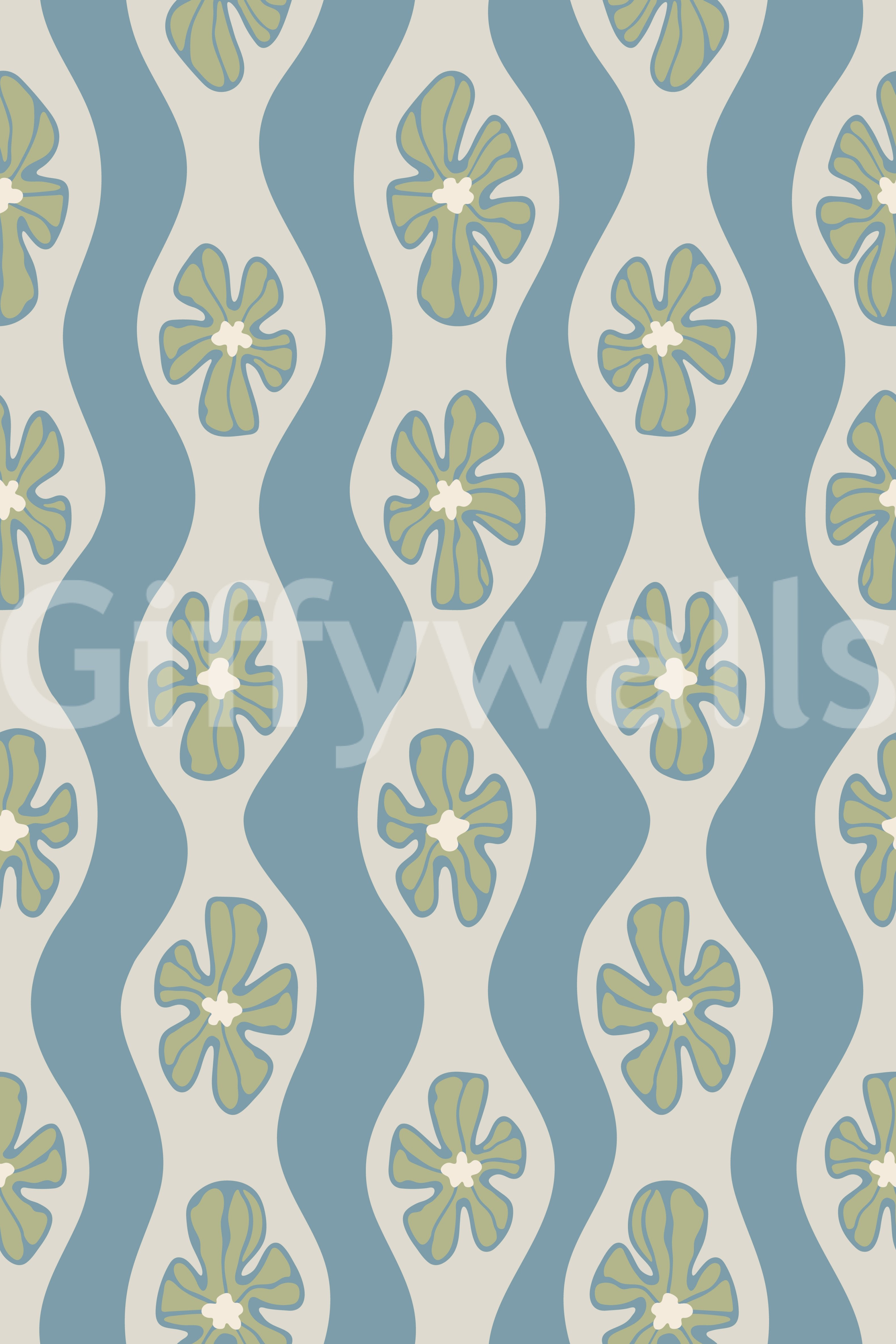 Transport yourself to a breezy cottage with this retro floral and wavy striped wallpaper. The Mid Century Modern influence is evident in the playful, abstract floral motifs rendered in soft, muted sage green and light gray, on a soft light blue background. Wavy stripes create a subtle sense of movement, lending a touch of whimsy to the design. This wallpaper evokes a feeling of calm and serenity, perfect for creating a relaxing and inviting atmosphere in any room. The cottagecore palette and flowing lines make it a charming addition to a vintage-inspired or contemporary space. This pattern design is also available in Other Colourways too! Original wallpaper pattern design by Jackie Tahara of UnBlink Studio.