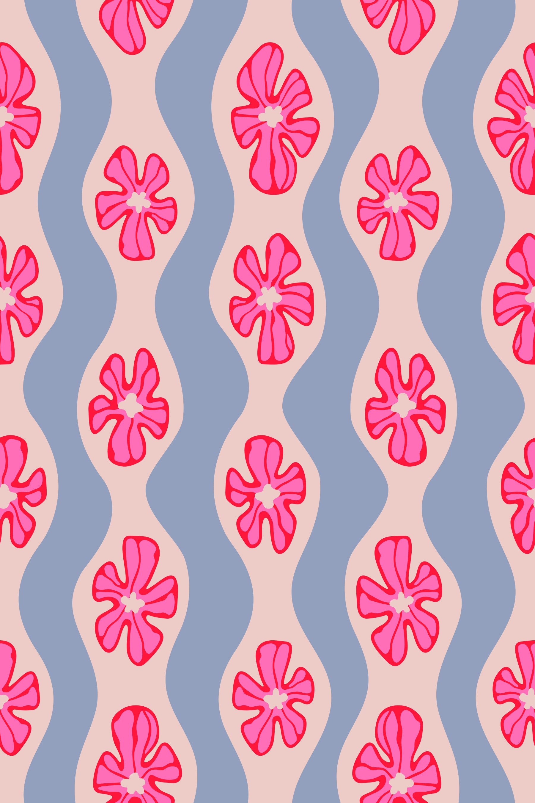 Step back in time with this gorgeous wallpaper, a delightful fusion of retro charm and bold flowers. This floral wallpaper evokes the essence of Mid-Century Modern Scandi design with its wavy stripes in light pink on a lavender background, providing a unique visual rhythm. Fuchsia hot pink and red flowers are feminine, glamorous and fun all at the same time, and add a touch of nostalgia and playful sophistication to any space. This pattern design is also available in Other Colourways too! Original wallpaper pattern design by Jackie Tahara of UnBlink Studio.