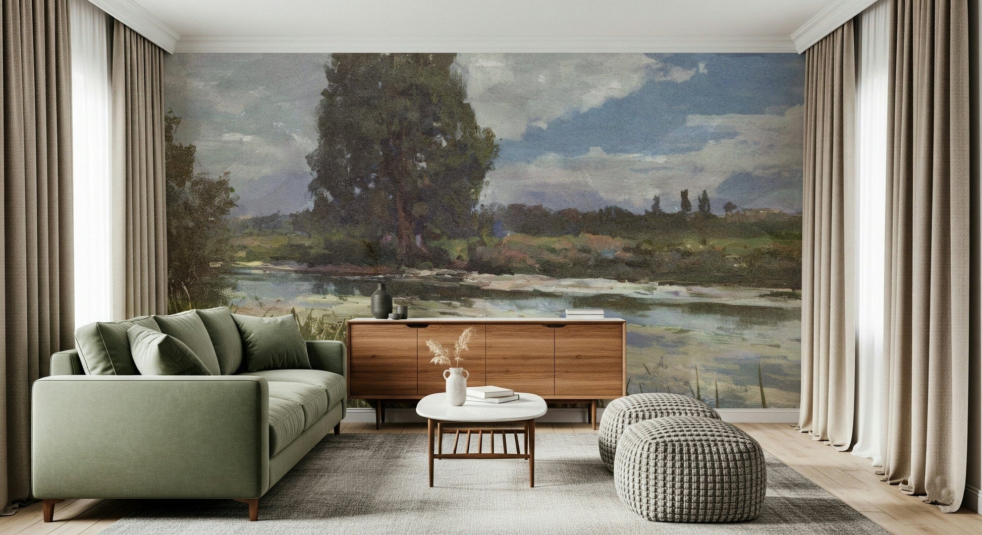 This serene landscape features a tranquil river, lush greenery, and a soft, cloud-dotted sky. The design, rendered in muted tones, captures a peaceful countryside scene. It's perfect for creating a calming atmosphere in any room. Consider this wallpaper for walls to introduce a natural elegance to your living room, bedroom, or home office. The scenic design complements both modern and rustic interiors, offering a touch of the outdoors.