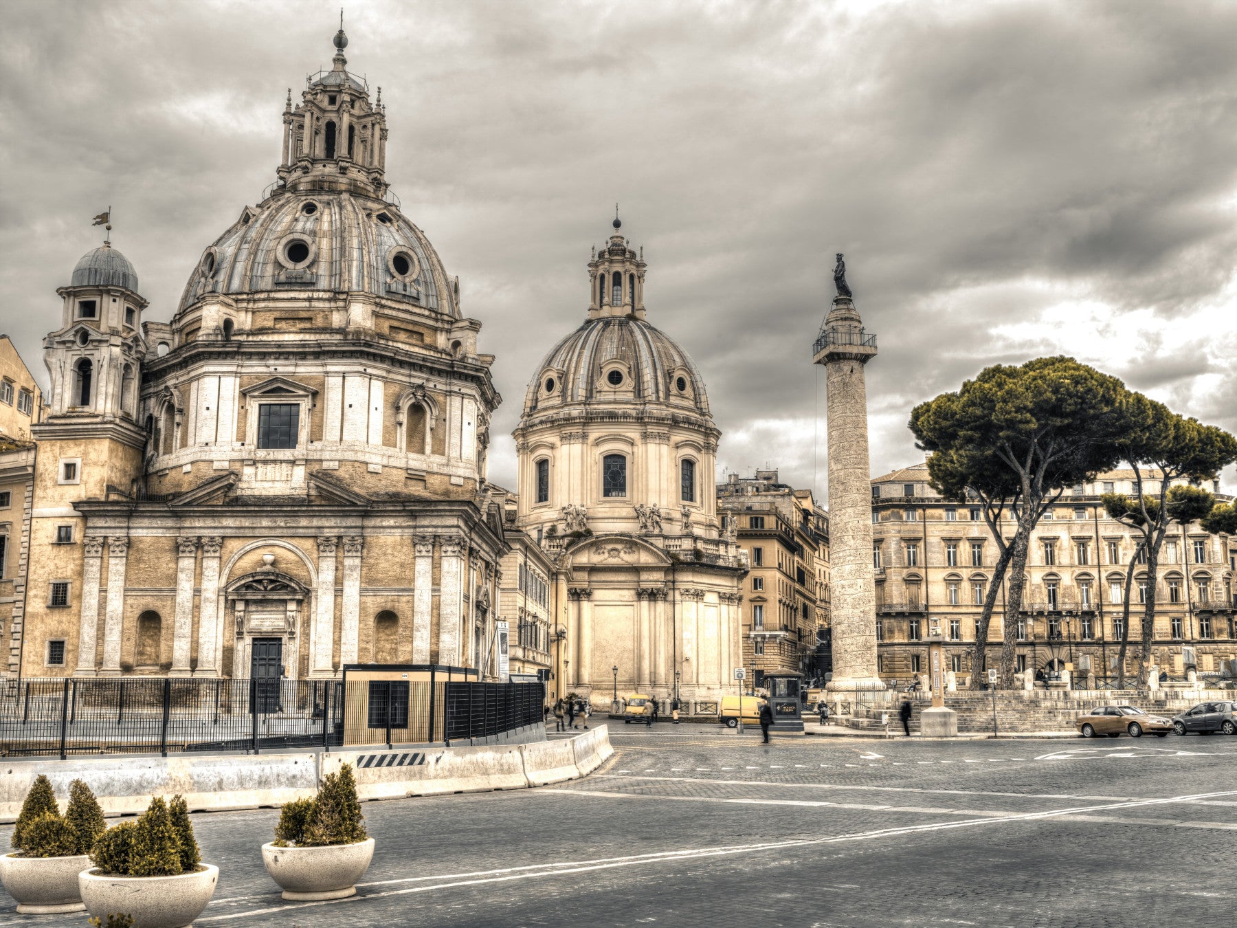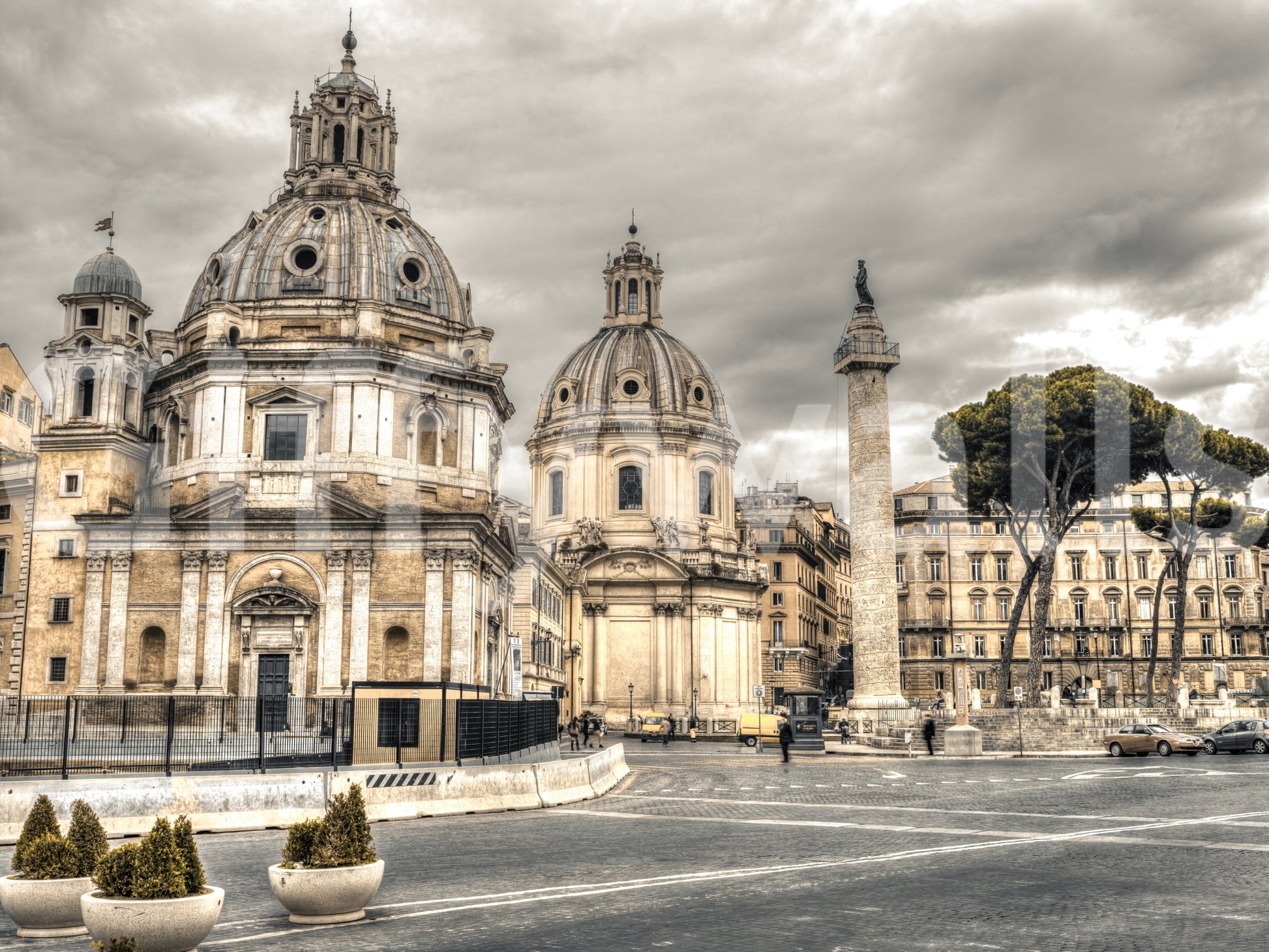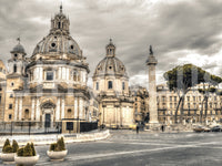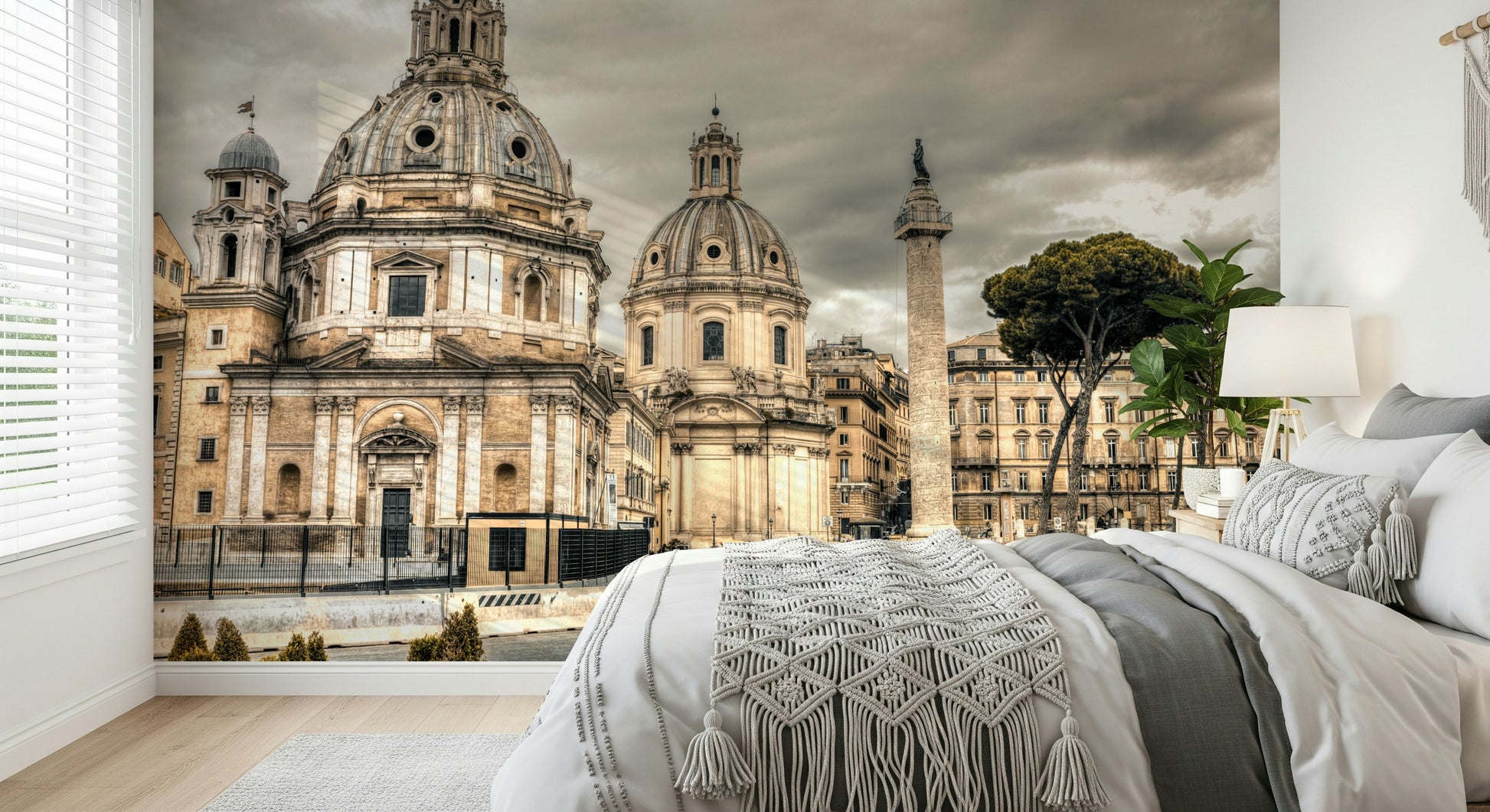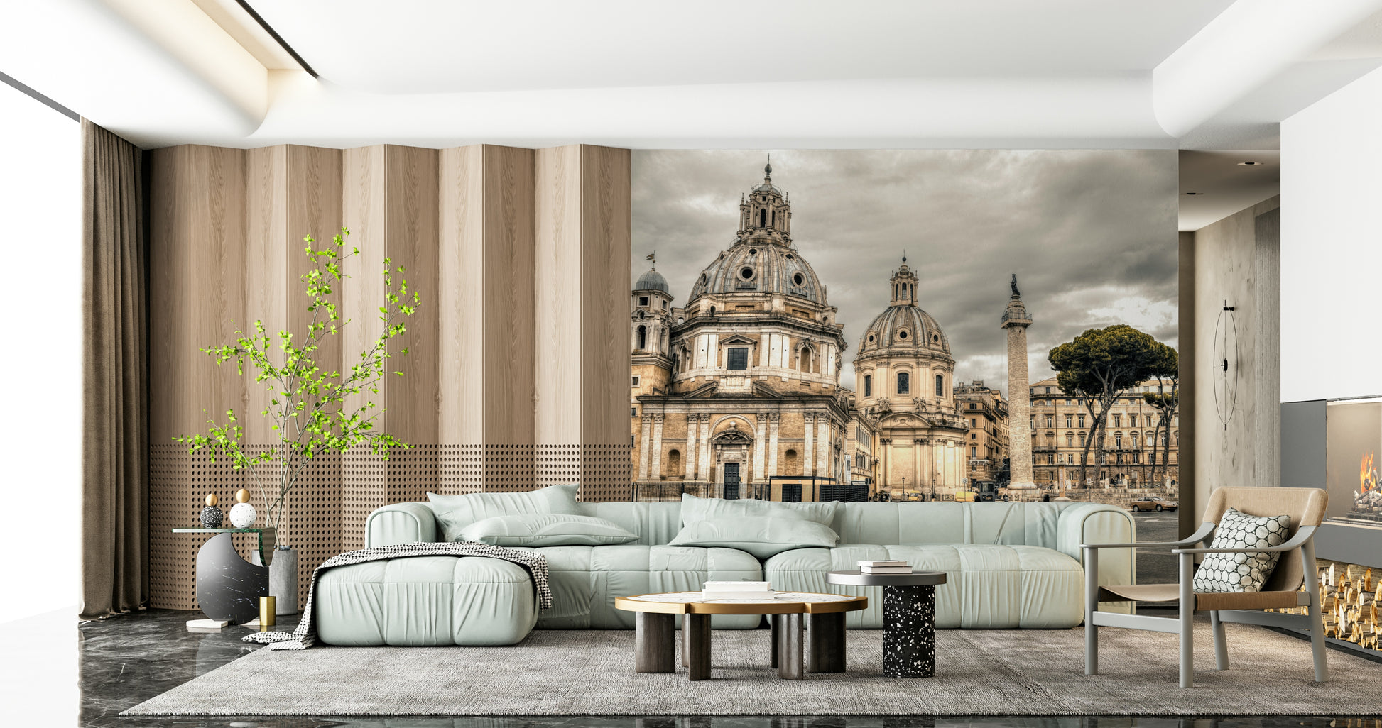 Santa Maria di Loreto church, Rome, Italy. Transform your walls with the timeless elegance of Rome. This wallpaper for walls captures the majestic architectural details and neutral palette of this historical city. The subtle tones create a versatile backdrop, working beautifully in a living room, dining room, or office. Imagine the character and depth it will add to your interior spaces, providing a sense of sophistication and calm. The intricate detailing and classical design elevate any room, infusing it with a rich cultural ambience and understated grandeur. Let this wallpaper bring the spirit of ancient Rome into your home.