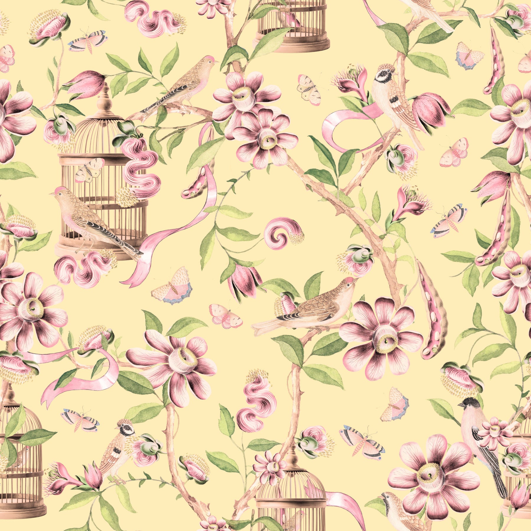This wallpaper is a stunning example of Chinoiserie style, blending delicate watercolor floral patterns with elegant birds. The soft palette of pastel pinks and pale yellows creates a romantic and tranquil atmosphere. Intricate details in the flowers and birds, coupled with the addition of birdcages and butterflies, add layers of visual interest and depth. The wallpaper’s delicate nature makes it suitable for a variety of spaces, from bedrooms and living rooms to hallways and nurseries, where it will create a serene and sophisticated ambiance. It’s a perfect choice for those seeking a touch of vintage charm and romantic elegance in their home.