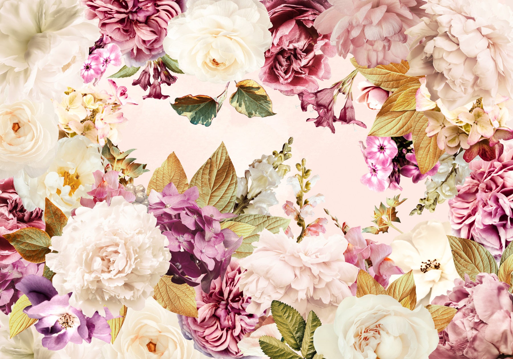 Indulge in the breathtaking beauty of a romantic garden with this stunning floral wallpaper. A profusion of exquisitely detailed peonies, roses, and hydrangeas in soft blush pinks, creamy whites, and delicate purples create a mesmerizing tapestry. The subtle interplay of light and shadow enhances the three-dimensional effect of each petal and leaf, while the inclusion of golden leaves adds a touch of vintage elegance. This wallpaper is perfect for creating a tranquil and sophisticated atmosphere in any room, from bedrooms and living rooms to hallways and entryways. Its soft palette and intricate design inspire a feeling of peace and calm, transforming any space into a serene haven of beauty.