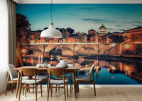 Capture the enchanting allure of Rome at twilight with this wallpaper for walls. The image features the Tiber River reflecting the iconic St Peter's Basilica and a historic bridge. Warm orange lights contrast against a cool blue sky, creating a dramatic yet serene atmosphere. Consider this for your living room or hallway to bring a touch of European elegance and historical depth to your decor. The design complements interiors with classic or modern design, turning any room into a visual journey.