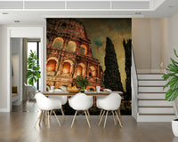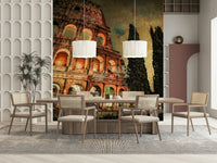This dramatic wallpaper presents a unique perspective of the Colosseum at night. The artistic treatment uses a blend of photographic detail and painterly brushstrokes, giving the image a rich, textured feel. The warm amber lighting on the ancient structure is strikingly juxtaposed against the dark, imposing cypress trees. The overall colour palette is moody and evocative, featuring deep browns, oranges, and blacks that create a sense of mystery and history. Perfect for those who appreciate bold aesthetics and historical subjects, this wallpaper will add a dramatic flair to any room.