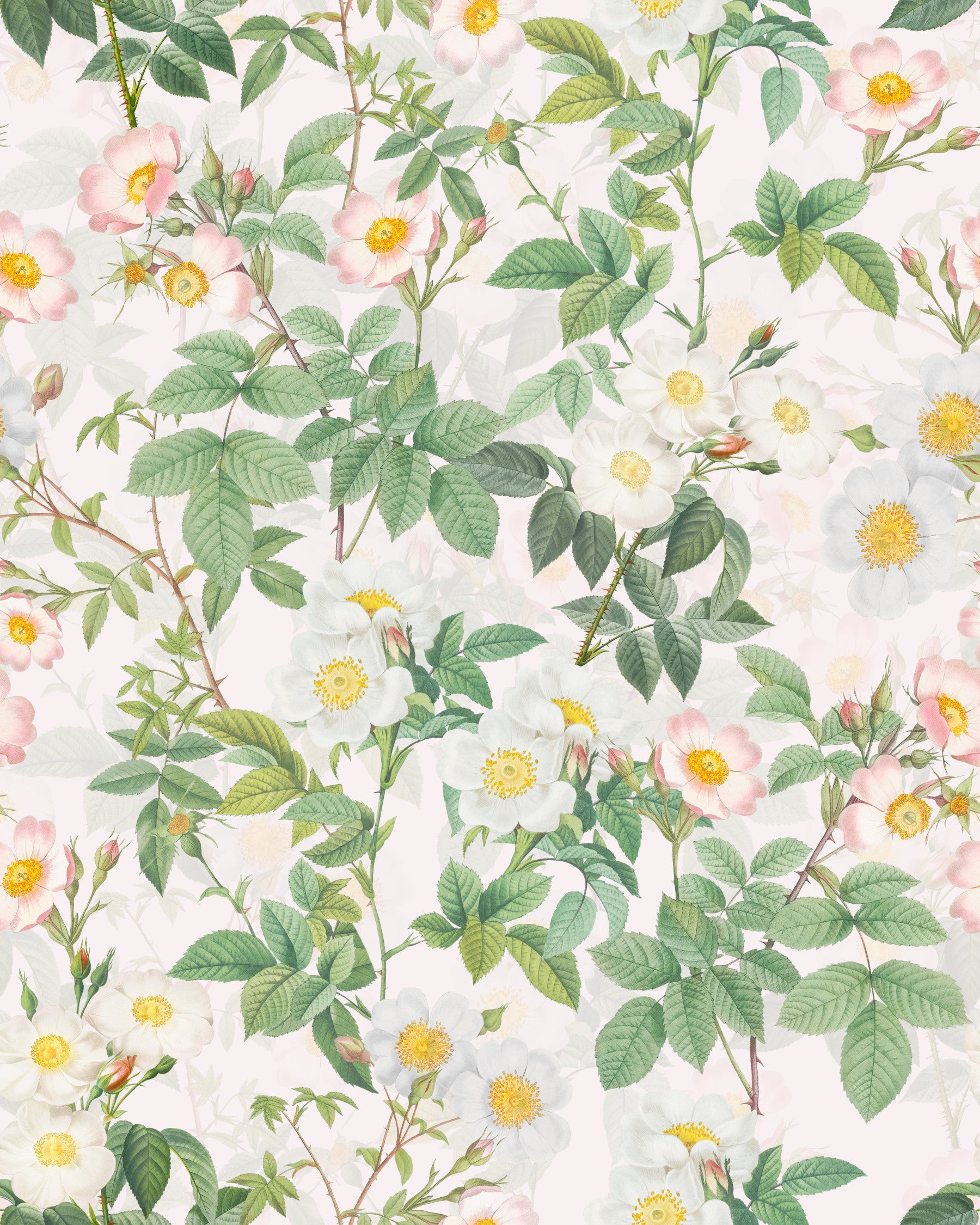 Delicate rose and green leaf wallpaper for peaceful spaces
