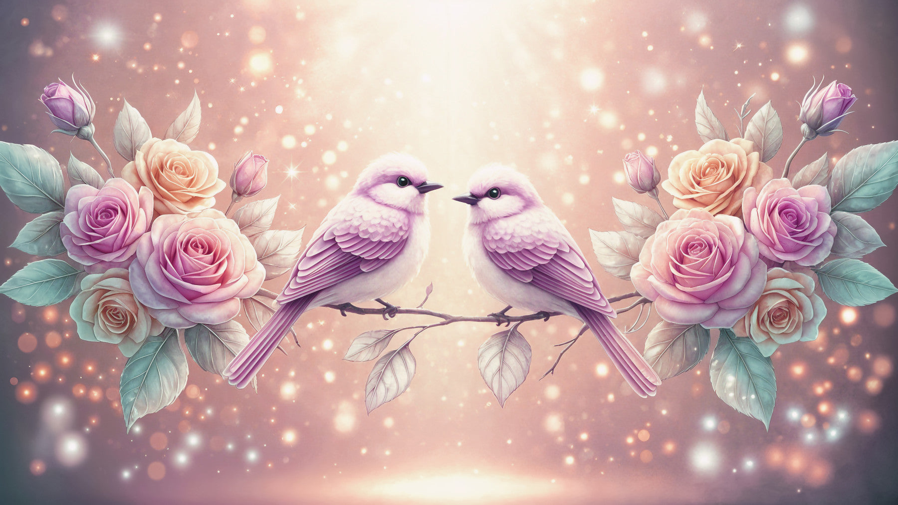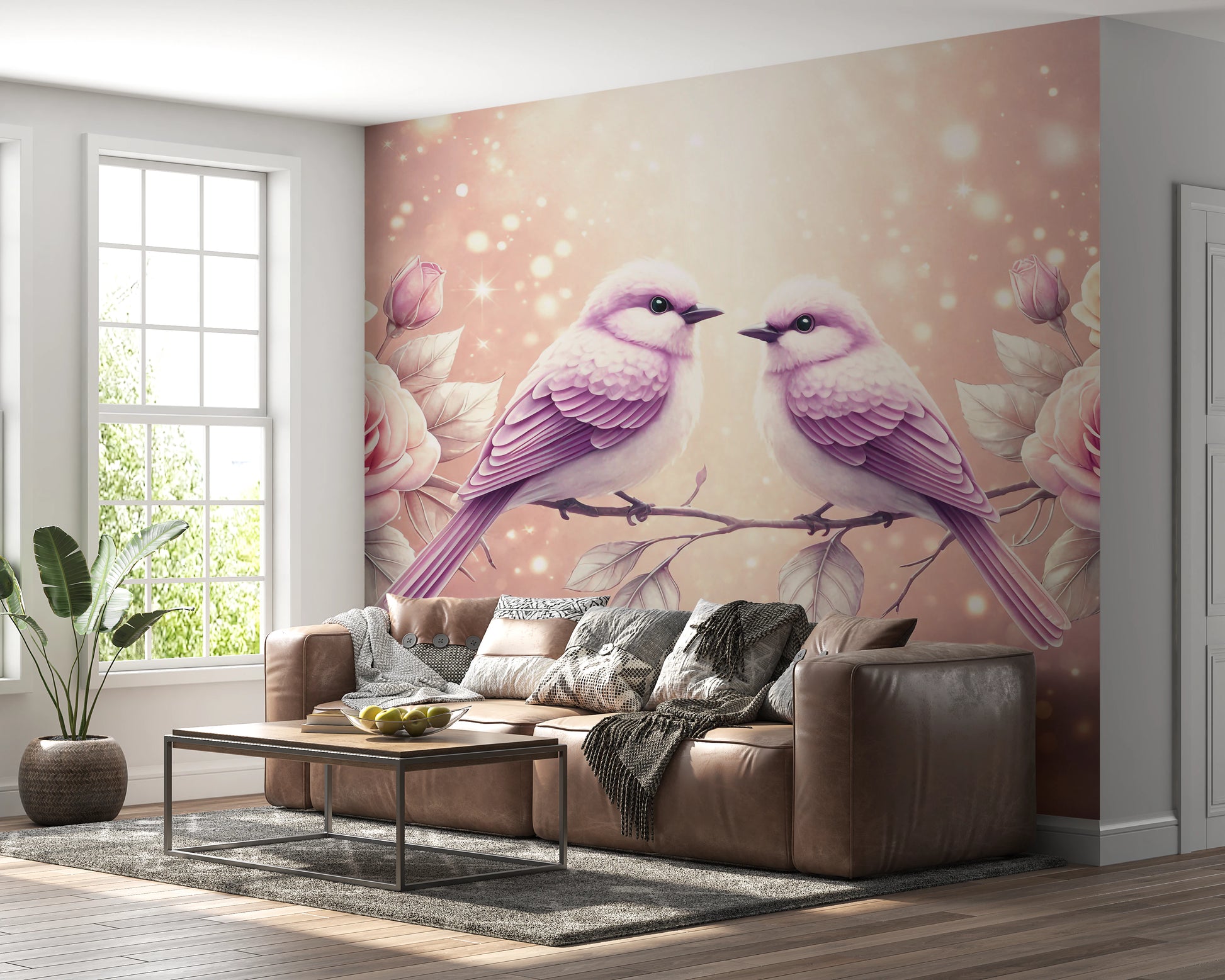 Transform your walls with this charming wallpaper. The design showcases two sweet songbirds perched on a delicate branch, surrounded by blooming roses in soft pink hues. The gentle colour palette and bokeh effect create a serene and inviting atmosphere. Perfect for bedrooms, nurseries, or living rooms, this wallpaper adds a touch of romance and elegance to any space. The intricate details and soft textures enhance interior spaces, bringing nature's beauty indoors and fostering a sense of tranquility.