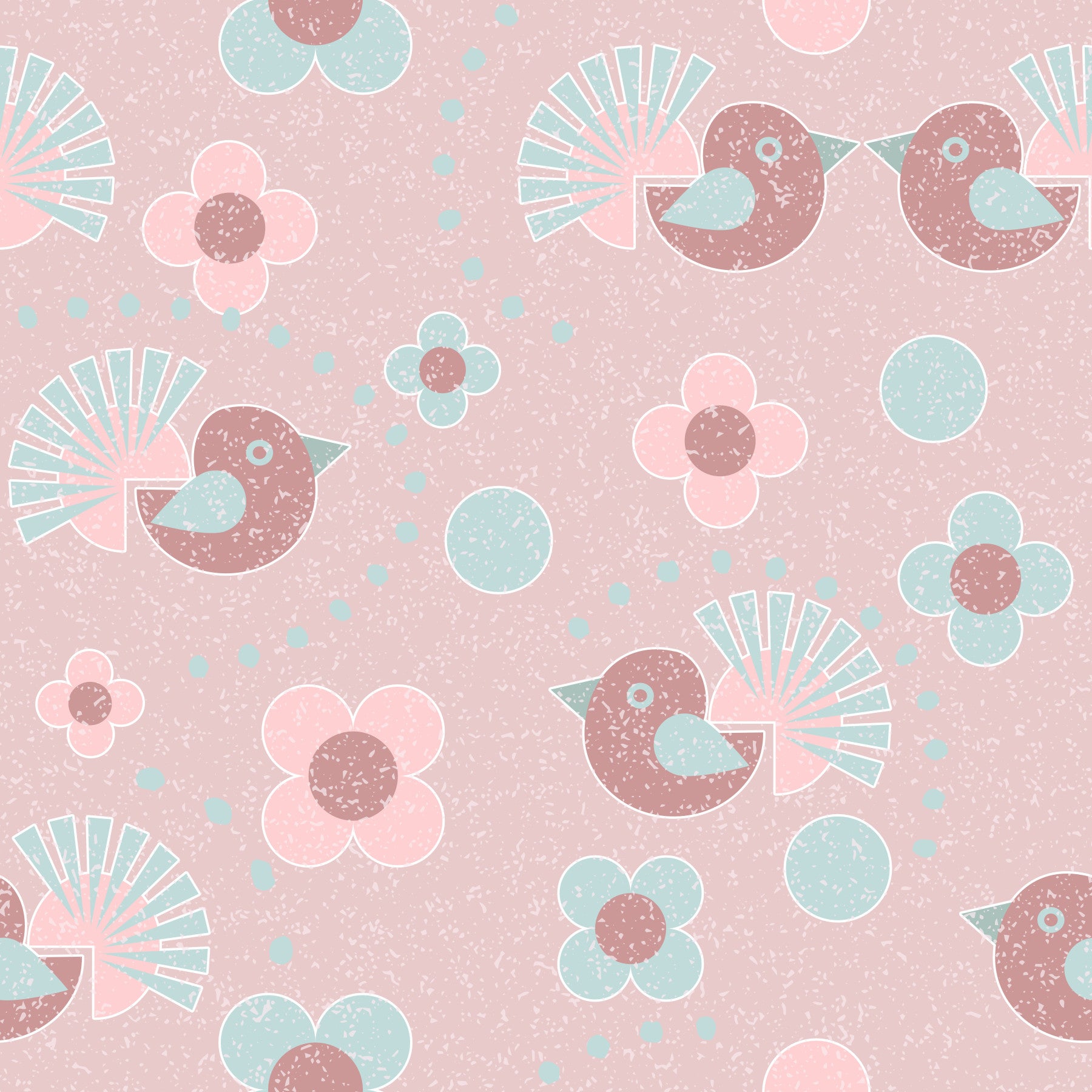 Indulge in the whimsical charm of "Rosebird Delight," a delightful wallpaper that brings a touch of vintage sweetness to your digital space. This charming design features stylised rose-hued birds with intricate, fan-like wings in muted teal, gracefully interspersed among pastel pink and teal blossoms. Soft circles add a playful, dotted accent across the dusty rose backdrop, creating a visually soft and calming atmosphere. The subtle, textured effect across the entire image gives it a tactile, nostalgic feel, reminiscent of hand-painted artistry. "Rosebird Delight" is perfect for creating a serene and inviting environment, adding a touch of gentle elegance to any device. Ideal for nurseries, bedrooms, or anyone who appreciates a touch of tender, retro-inspired beauty.